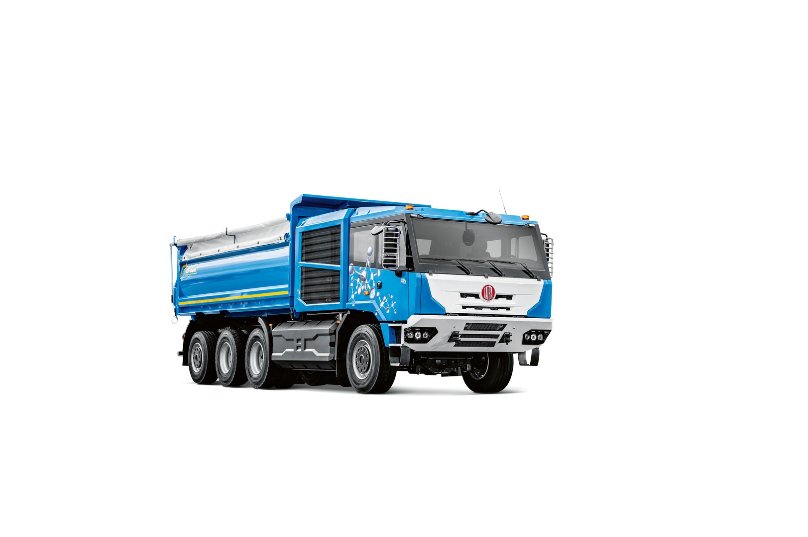 The TATRA FORCE e-DRIVE Hydrogen extends the range of heavy-duty off-road trucks featuring particularly safe cabins with a zero-emission technology variant: an 8x6-3-side tipper with fuel cell, electric drive motor and traction battery. All of the technology is located behind the low cabin and is protected by covers that pick up the design of the cabin. Hydrogen tanks marked with a large H are mounted between the first and second axle. In addition, a hydrogen molecule graphic on the cabin emphasises the use of hydrogen as an energy source.