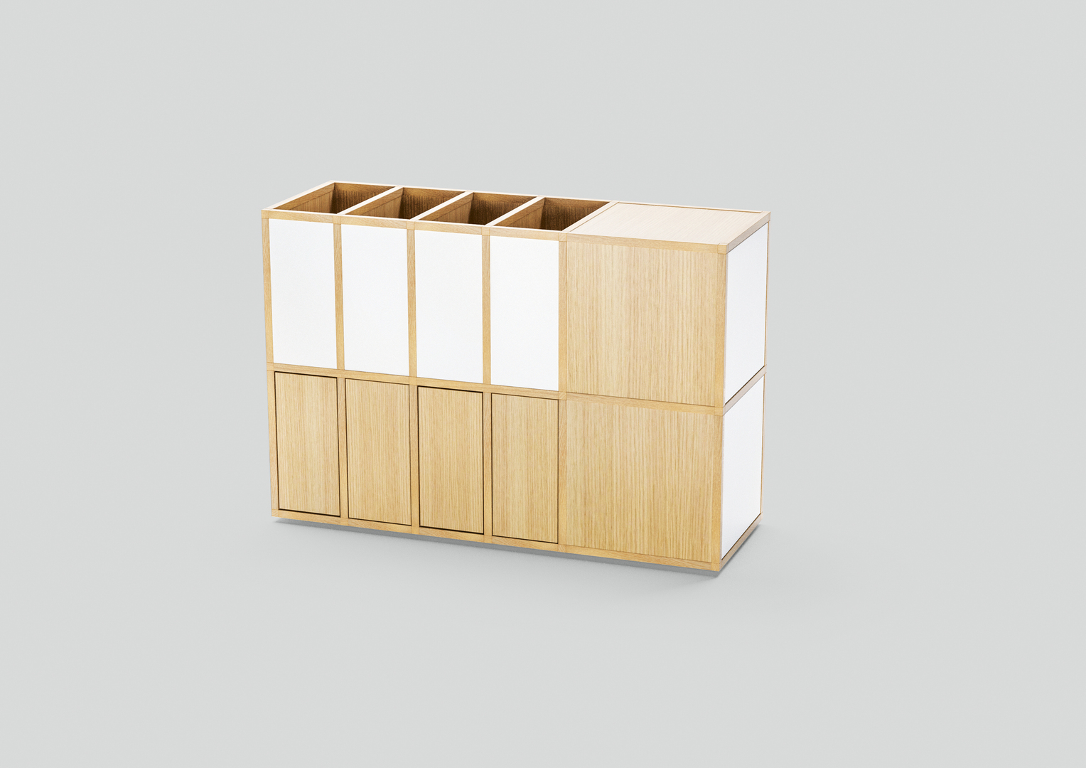 The patented Tavar shelving system consists of panels and connectors that can be assembled without the need for any tools. A double tongue and groove system fitted with magnets ensures the precise positioning of individual elements and provides safe, sturdy support. The versatile system can be reassembled in different combinations to suit personal tastes and can be extended in all directions with a 20 cm grid. Complementary accessories include doors, drawers and glass elements. The materials used meet ecological requirements.