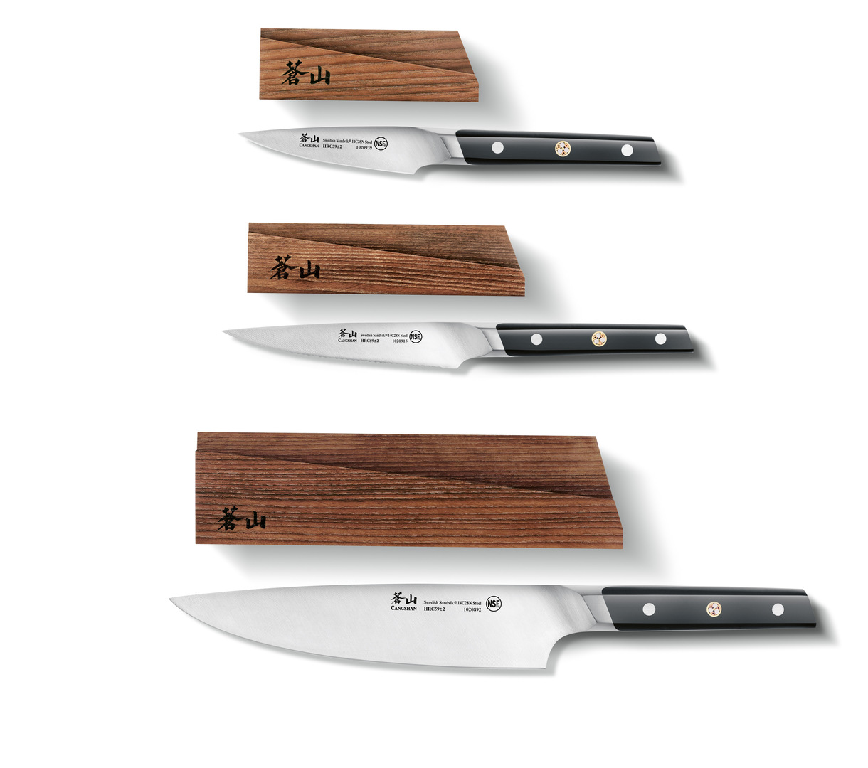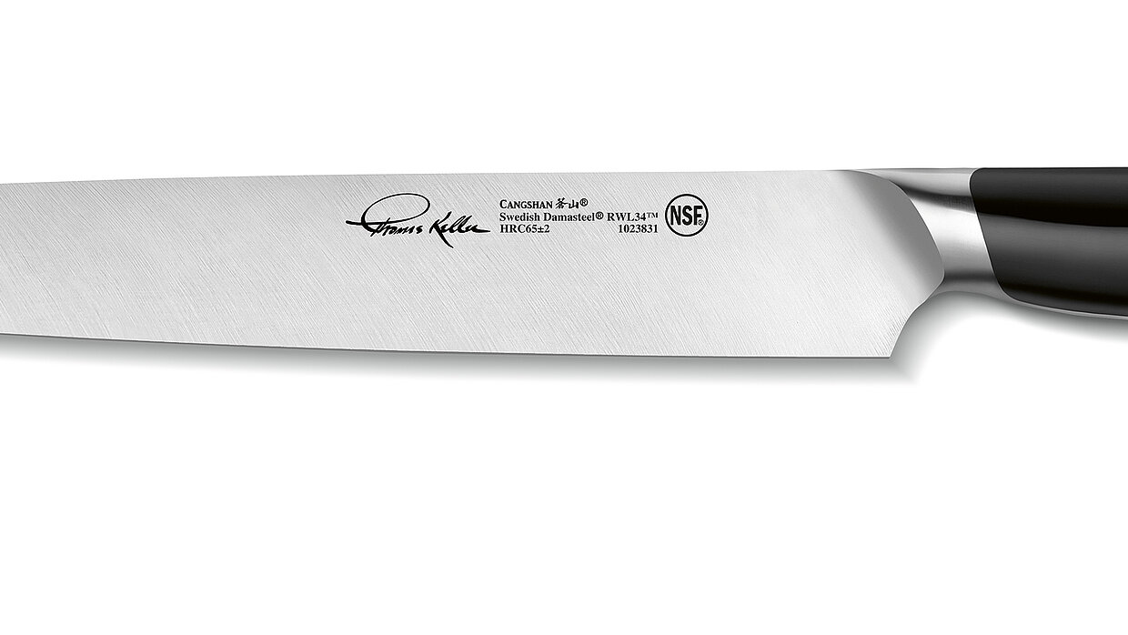 The TC series of kitchen knives are forged and handcrafted from high-alloy Swedish steel. The heat treatment of this stain-resistant steel gives each blade outstanding durability and exceptional edge retention. A visually distinctive mosaic rivet in the handle offsets the knives’ straightforward aspects of the design. Each knife comes with a carbonised ashwood sheath featuring an integrated magnet to safely secure the knife blades and protect them against scratches during storage.
