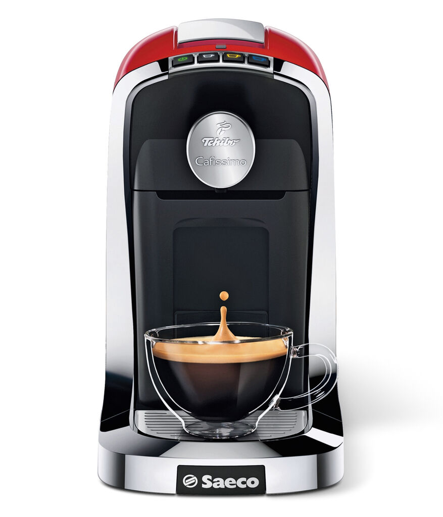 The Caffissimo Tuttocaffè is a compact coffee machine conceived for Tchibo coffee drinkers. The appliance has a movable cup stand for various cups and glasses and offers a variety of coffee drinks at the touch of a button, thanks to its easily operated user interface. A combined high/low pressure brewing system facilitates preparation of every kind of coffee drink with a compact machine. The appliance is available in black, white and red.