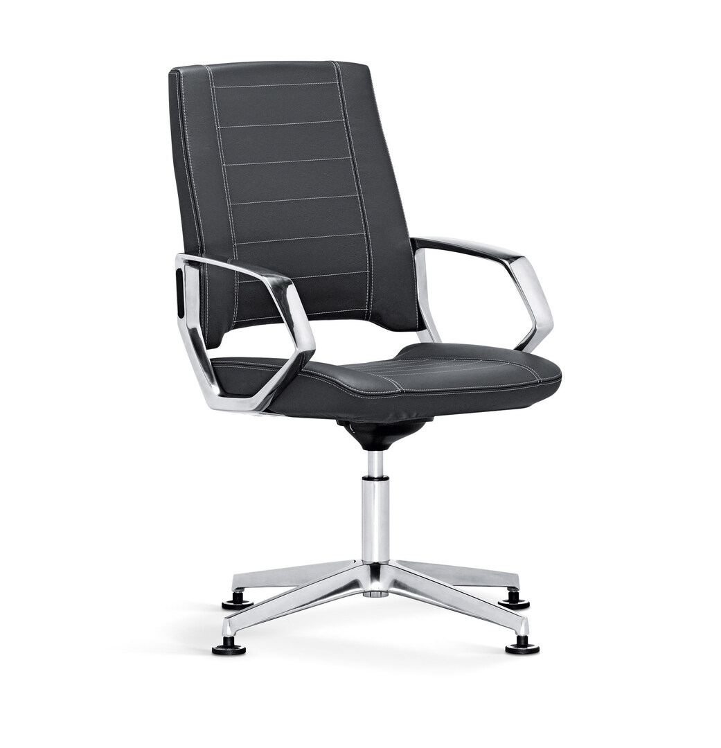 The TEA 1322 conference swivel chair shows a well-balanced design and the combination of modern technology with high utility. Its characteristic design feature are the distinctive aluminium armrests that connect the backrest and seat. The conference swivel chair is optionally available with a rocking mechanism as well as an auto-return function. A four-star aluminium base lends the chair stability. The armrests are also available in a standard anthracite PUR version.