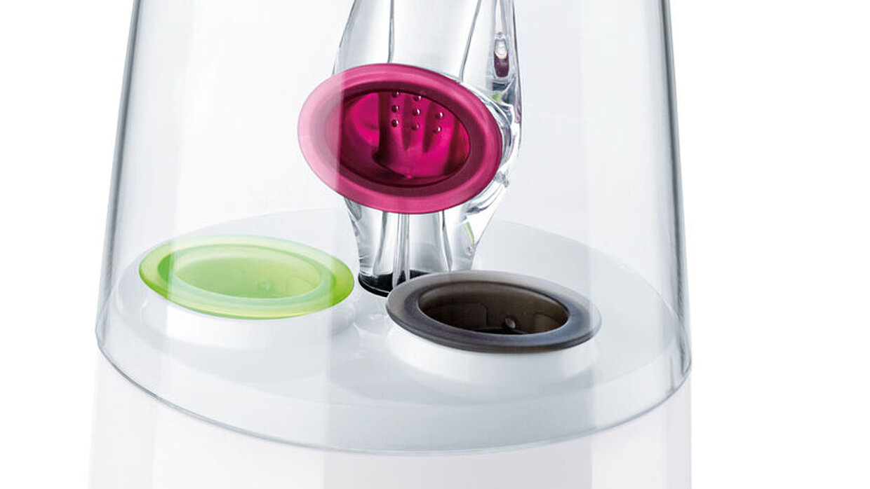 Teo is different from other tea jugs, above all due to its two sieves: the bigger filter has vertical slits for brewing fresh mint or similar herbs. The smaller filter with horizontal meshes can be placed in the bigger filter and thus provides a very fine sieve for loose tea sorts. The jug is made of borosilicate glass and plastic and is a continuation of the traditional craftsmanship of Bohemian glass workers.