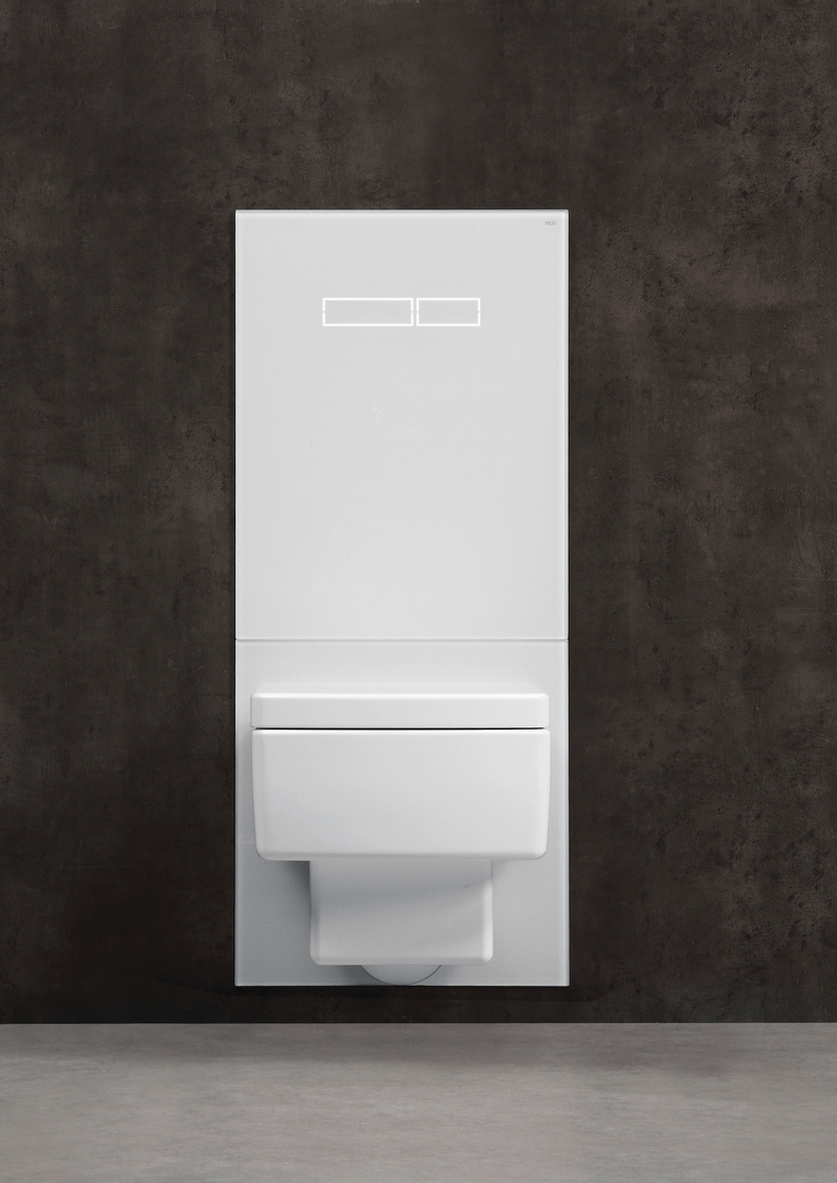 Just a flat, white glass panel on the wall – nothing else of the TECElux WC terminal is visible. As you approach, the electronic flush lights up and an almost silent extractor fan starts up. The glass plate consists of two parts. The upper part is easily removable for maintenance after installation; and thus, all functioning parts of the appliance are accessible and can be extended. The height of the bowl can also be adjusted.