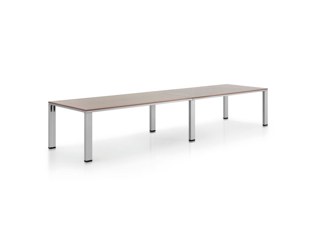 A table that doesn’t wobble: the elegant telos conference table system’s tapered profiles, located beneath the table surface, are wedged together by an eccentric tappet into a force-fit connection that leaves no gap. Extending underneath the entire length of the table, these profiles allow it to connect to another table with just one click. The legs of the table can be slightly repositioned in order to link two tables together while simultaneously lending additional support.