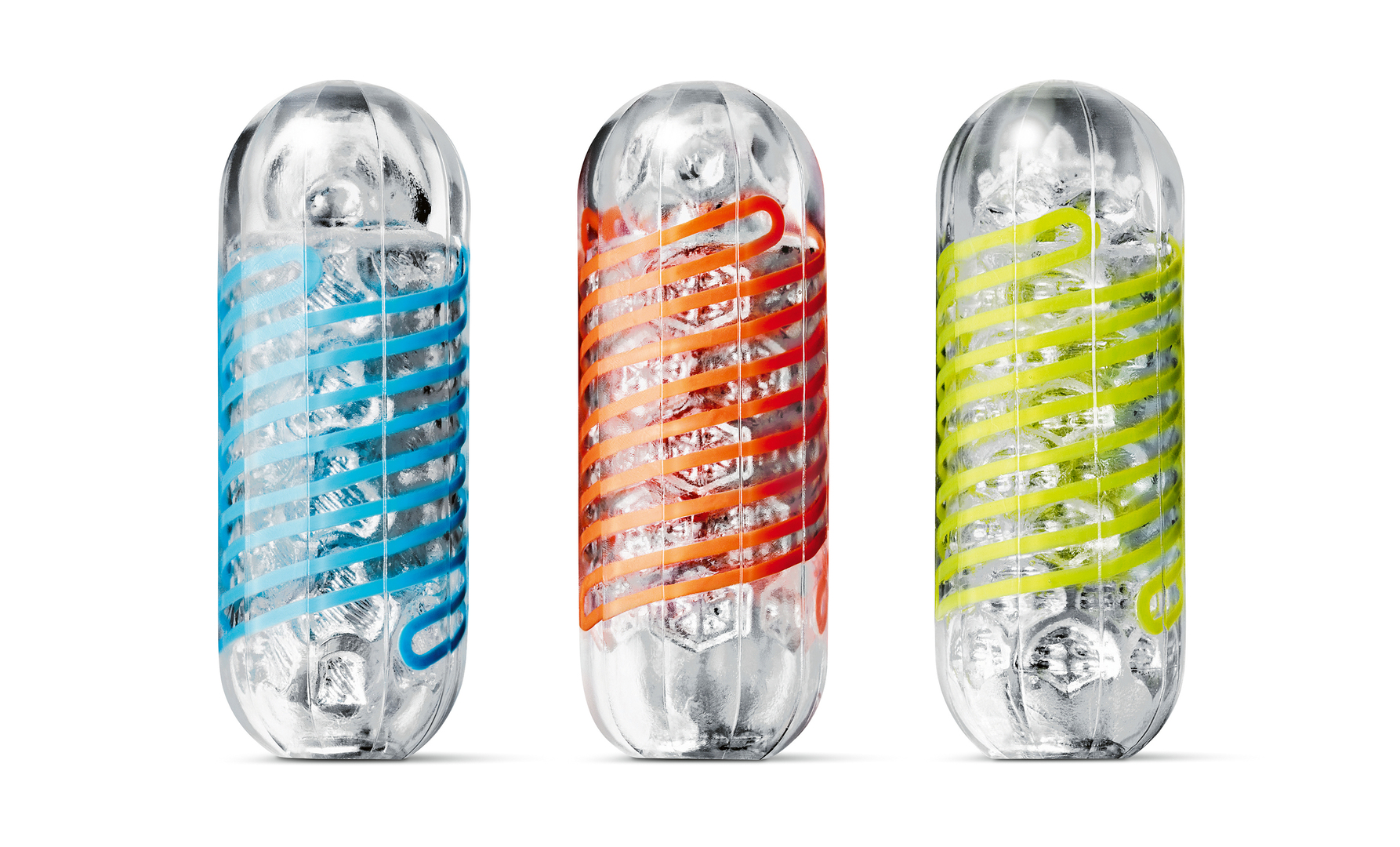The SPINNER integrates a new technology that offers functional advantages. A coil embedded in the elastomer cover gives it its unmistakable appearance and widens when inserted. During use, contraction and expansion of the coil alternate, creating an automatic rotation. Three different versions of the nobby textures inside are available. They have been fine-tuned to optimise the airflow from inside upon insertion. After washing, the product, whose fresh, unusual design is intended to give a positive feeling, can be dried in the packaging.