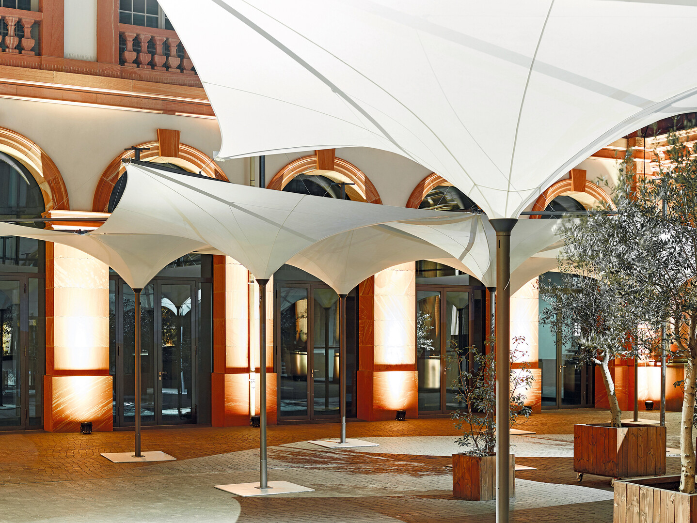 The vaulted form of the modular Tensilation canopy system provides an expressive structure that can be used for events, pop-up spaces and as waterproof walkways or permanent outdoor fixtures. The combination of square and diamond-shaped canopy units allows for an almost infinite number of plan configurations. The clear design merges flexibility in the form of easy adaptability with many different setup situations, displaying a high degree of resilience. Weighing only 38 kg, the system offers an innovatively light structure. The design based on canopies, which are attached by textile connectors, is highly functional.