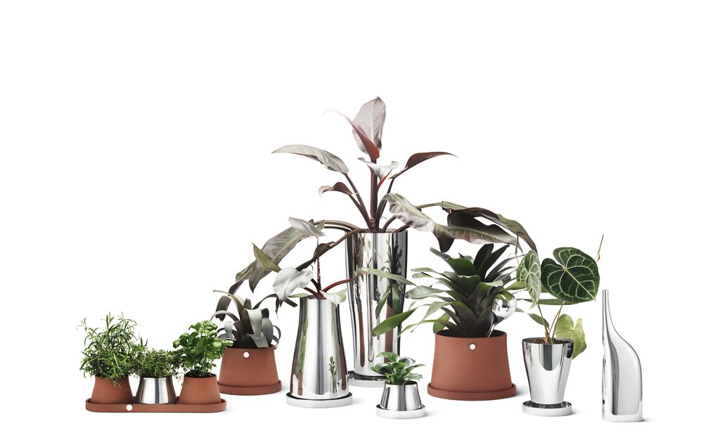 Inspired by flowing forms found in nature, Terra combines the natural feel of terracotta with cool stainless steel. Due to the homogeneous contours of the vessels, both materials blend to create a harmonious overall appearance. The nine-piece product series embodies an urban aesthetic and is designed for both indoor and outdoor use. It includes plant pots of different sizes with matching coasters as well as a stainless steel watering can of sculptural appeal.