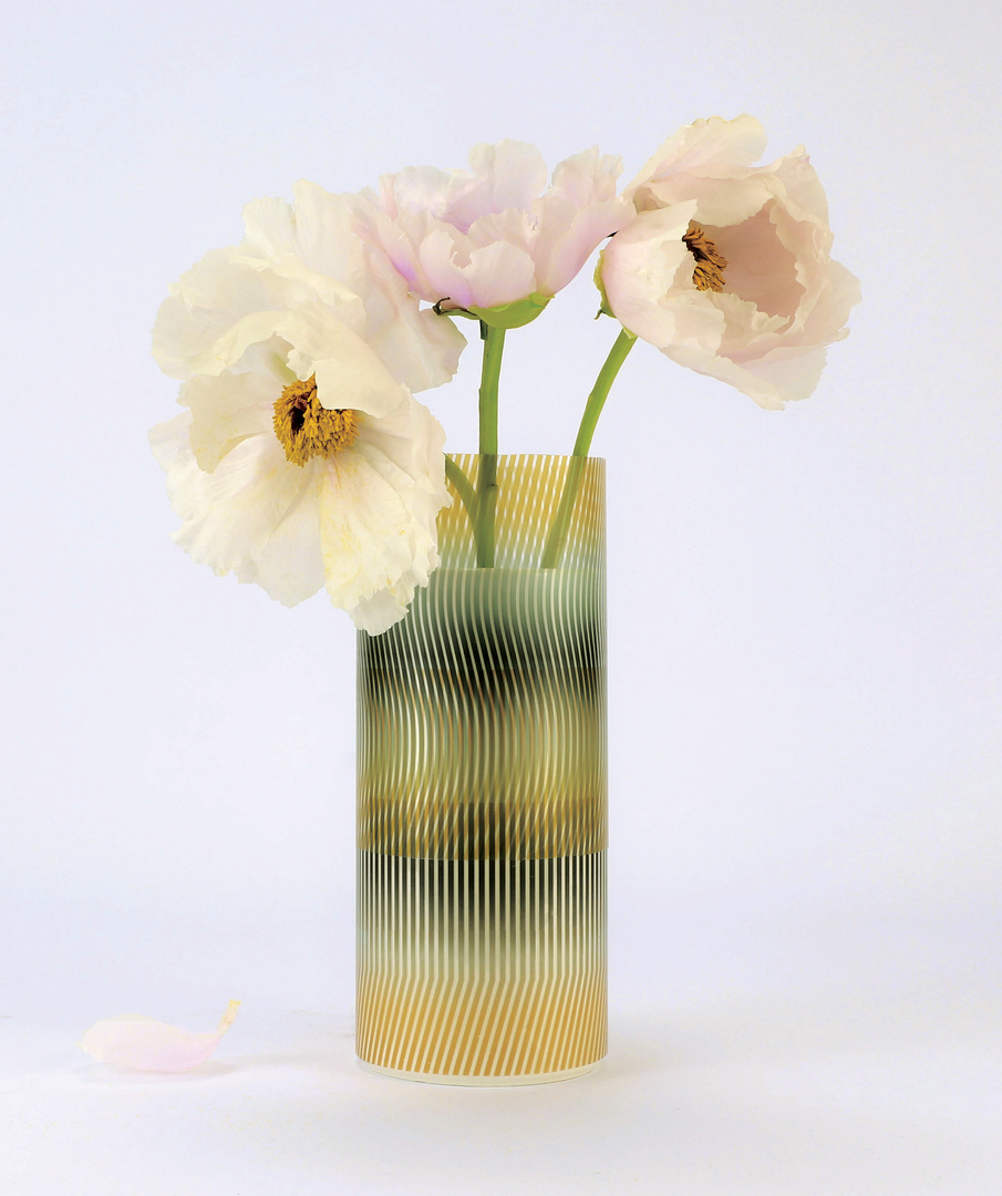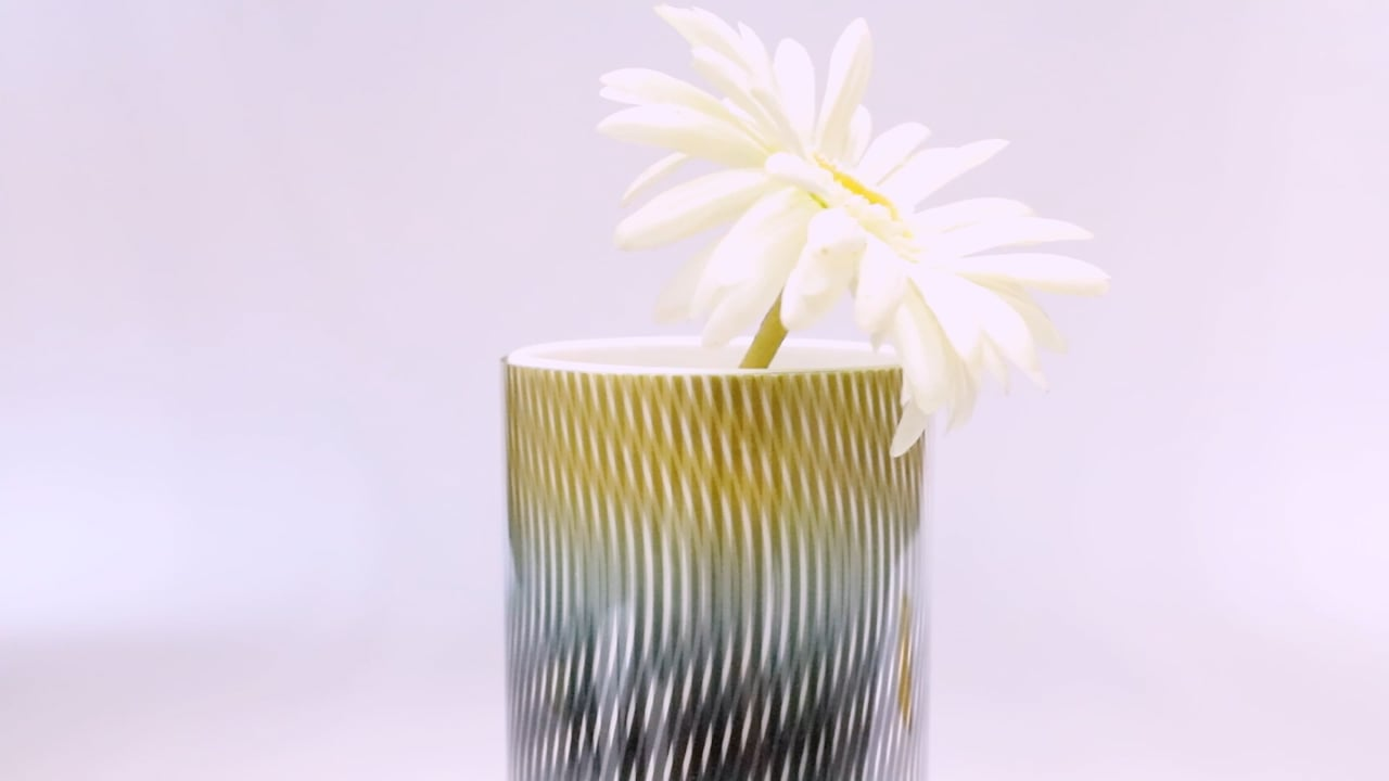Textured Vase is a white ceramic vase with two transparent plastic layers that have patterned textures on the outside. When the layers overlap, various patterns are superimposed to produce rich and unique visual effects of intersecting lines and clashing colours. Users can rotate the layers to match the flowers they have. The curve of the line will also ‘move’ while rotating, thereby creating interesting visuals. Additionally, by vertically sliding the layers, the vase’s height can be adjusted to accommodate different flower lengths.