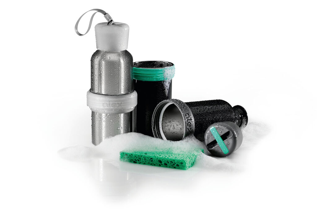 The Alex water bottle is made of eco-friendly stainless steel without toxins or BPA (Bisphenol A). Its innovative design features a mid-body split called Clean Seam Technology, for which a patent is pending. It allows the bottle to be easily cleaned by hand or in the dishwasher. The water bottle can be compacted down to half its size, which is a decisive space-saving factor for shipping or travelling. Its uniform shape allows a mixing and matching of different bottle colours and sizes.