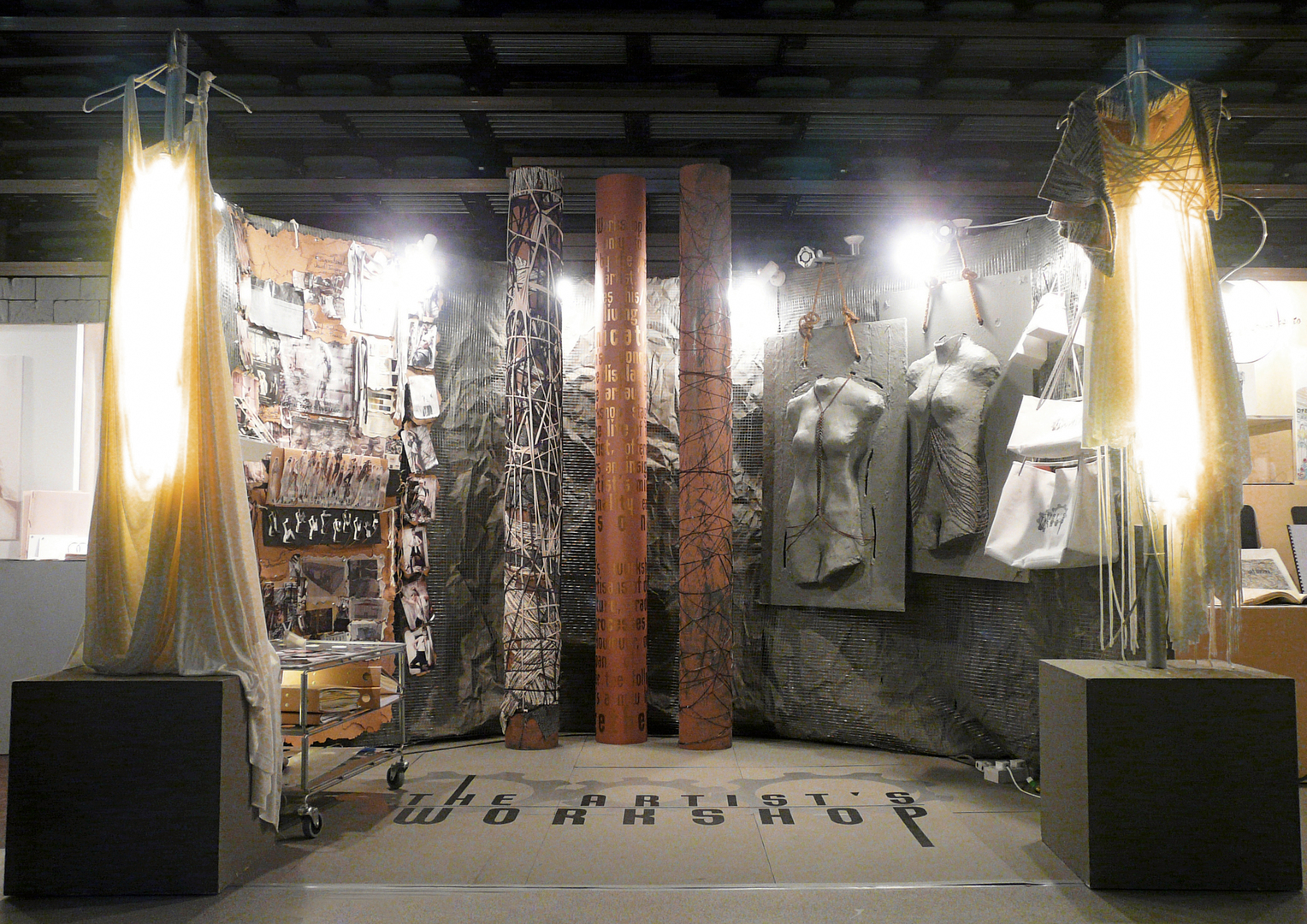 Inspired by the ideation process of constructing a product, The Artist’s Workshop showcases a conceptual brand selling fashion garments and jewellery. It aims at ennobling the ignoble to communicate the intangible as well as the beauty of turning improbable dreams into reality. Using discarded materials from the collection, the pillars idealise the statement that through design and innovation even the unwanted can be given a new lease of life. Captivated by the dress forms used by the jewellery designer to drape prototypes, embossed dress forms were created using a cement and paper-mâché blend to display the product as the creator envisioned. The exhibition space invigorates the expression that the spirit of creation is not limited by technology or materials but rather engendered by one’s imagination.