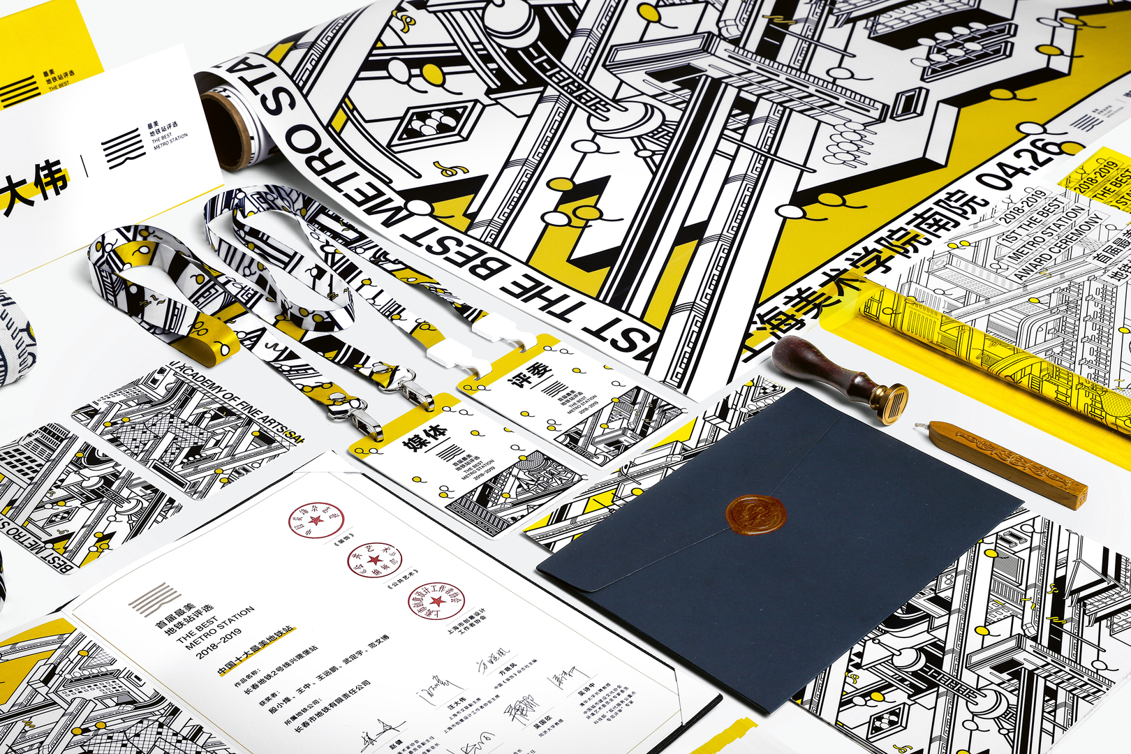 The search for the best metro station in China is a large-scale national campaign, co-sponsored by design magazines and the Shanghai Creative Design Workers Association. The key visual for the event uses a selected city’s landmark buildings and integrates the architectural forms in a geometric, nested composition. The metropolitan theme is interpreted in a distinctive black-and-white scheme, offset by yellow accents. By showing ingenious railway constructions, the illustrations highlight the connecting function of rail transit in urban areas.