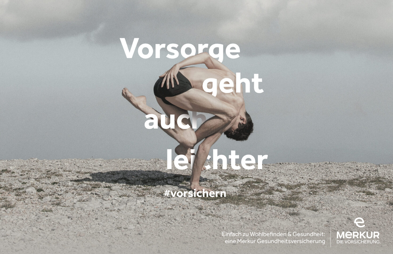 The fact that preventative health care does not necessarily have to be complicated is demonstrated in a print campaign called “The easy way” by Merkur Versicherung AG. At the centre of the motifs, photographed in an idyllic landscape or in front of a plain concrete wall, is a performer of Cirque du Soleil. He dominates the image with spectac-ular exercises and attracts the attention of the observer. The text, which is arranged around him, stands in clear contrast to his contortions and gets right to the point: it can be much easier – with the right insurance.