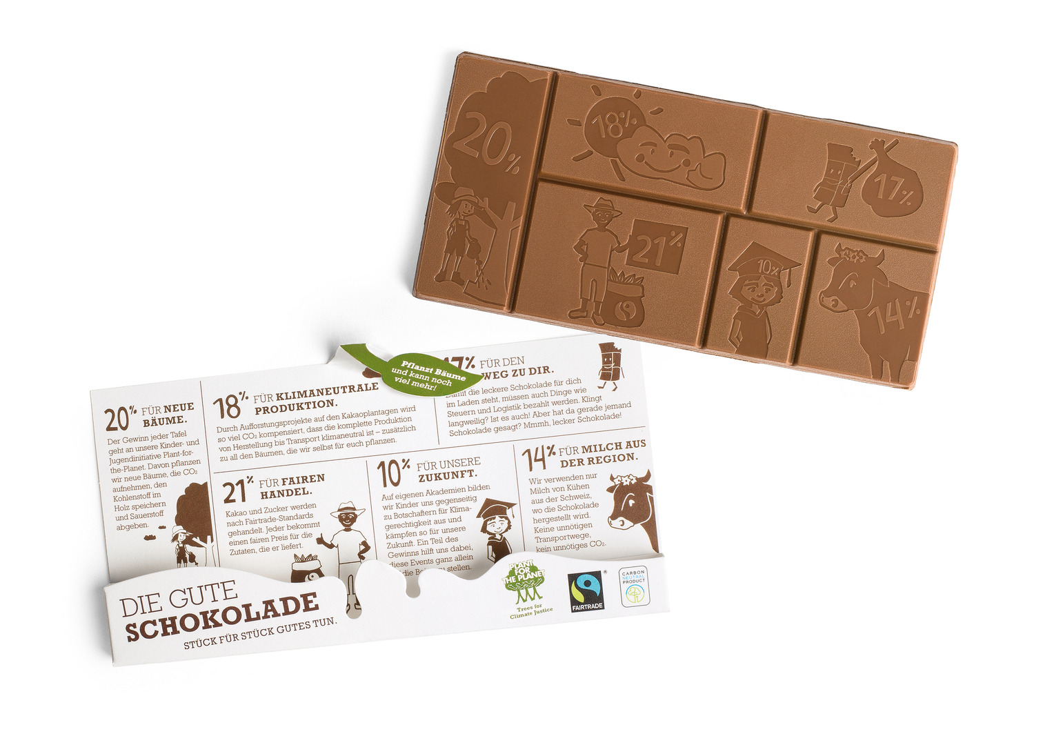 This product, initiated by the Plant-for-the-Planet initiative, illustrates how good can be done with chocolate piece by piece. The Good Chocolate breaks away from the typical partitioning of a bar of chocolate because each piece is different in size. The sizes reflect the percentage share of the sales price, which goes to individual aid projects. The child-oriented illustrations on the unusual bars support the message clearly and convey it to young consumers in a simple and efficient way.