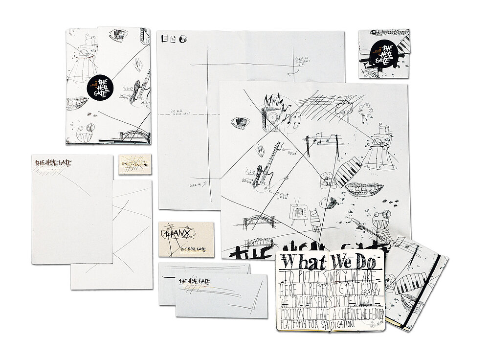 The Hellgate is a syndication platform and a collective, based in New York, which discovers and represents contemporary photography talents, inspired by the music scene. The visual identity combines the unique elements and features of the company: custom approach to the creative needs of each project, portfolio combination of amateur and professional photographers, and a set up different than any other traditional photo agency. The logo embraces all these elements and functions as a personal signature in the applications. The cheap papers used, in combination with the gold typography and handmade sketches, create an uncanny effect. The specially designed multi-purpose tool can be folded in various ways and used as a notebook cover, a CD case and