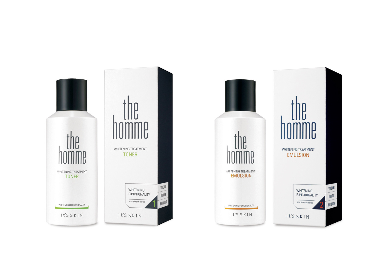 Behind the brand name “the homme” is a basic skin-care line targeting men in their twenties and thirties. Since this brand consists of two lines, the packaging features different designs. The containers for the Oil Control line are coated in black and blue to express the refreshing sensation and the powerful aspect of the products, whereas the Whitening line is coated in white and pearl to express its intuitive care effect and to lend the product a luxurious appearance. The transition from the shoulder line of the bottle to the base is minimised to enhance the strength and sovereignty of this men’s cosmetics product.