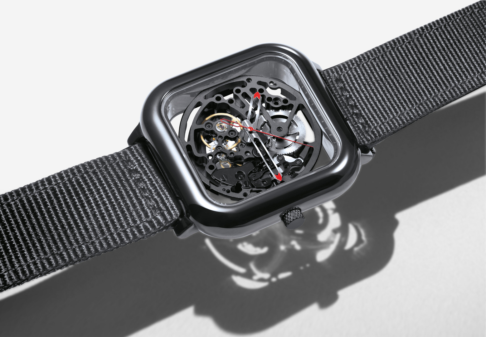 The design of this mechanical men’s watch with skeleton structure draws attention to its innovative inner workings. The usual fixing connection between mechanical movement and case has here been replaced by a flexible connection. This acts as a buffer and increases the shock resistance qualities of the watch. A heavy-duty ceramic case, thick sapphire glass and the hard-wearing nylon strap provide added durability. The contrast between the square case and the round elements of the movement give the watch its distinctive appeal.