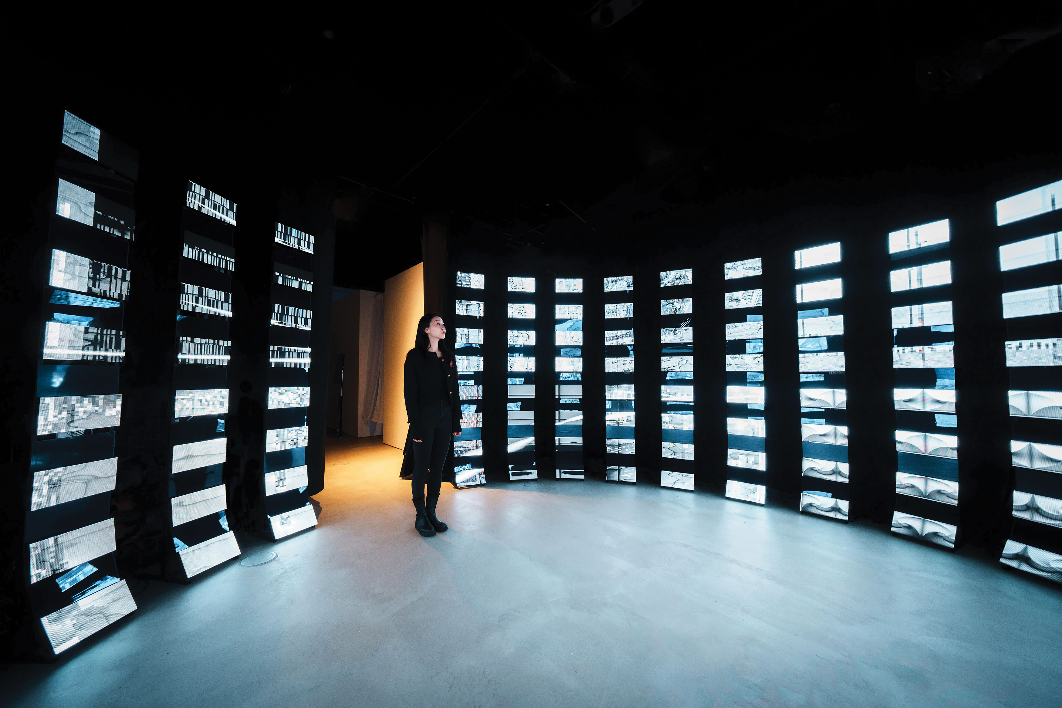 Live CCTV footage from around the world is displayed on LED panels throughout the pavilion. The person-detection module identifies the number and location of people in the CCTV footage in real time, converting this data into sound. This sound is then transformed into music by recognising the spectator’s motion through the camera where the work is installed. When interactions between the artwork and the audience occur, the artwork greets the audience with a ‘hello’ in nine languages, and graphic effects emerge through alterations in resolution and saturation.