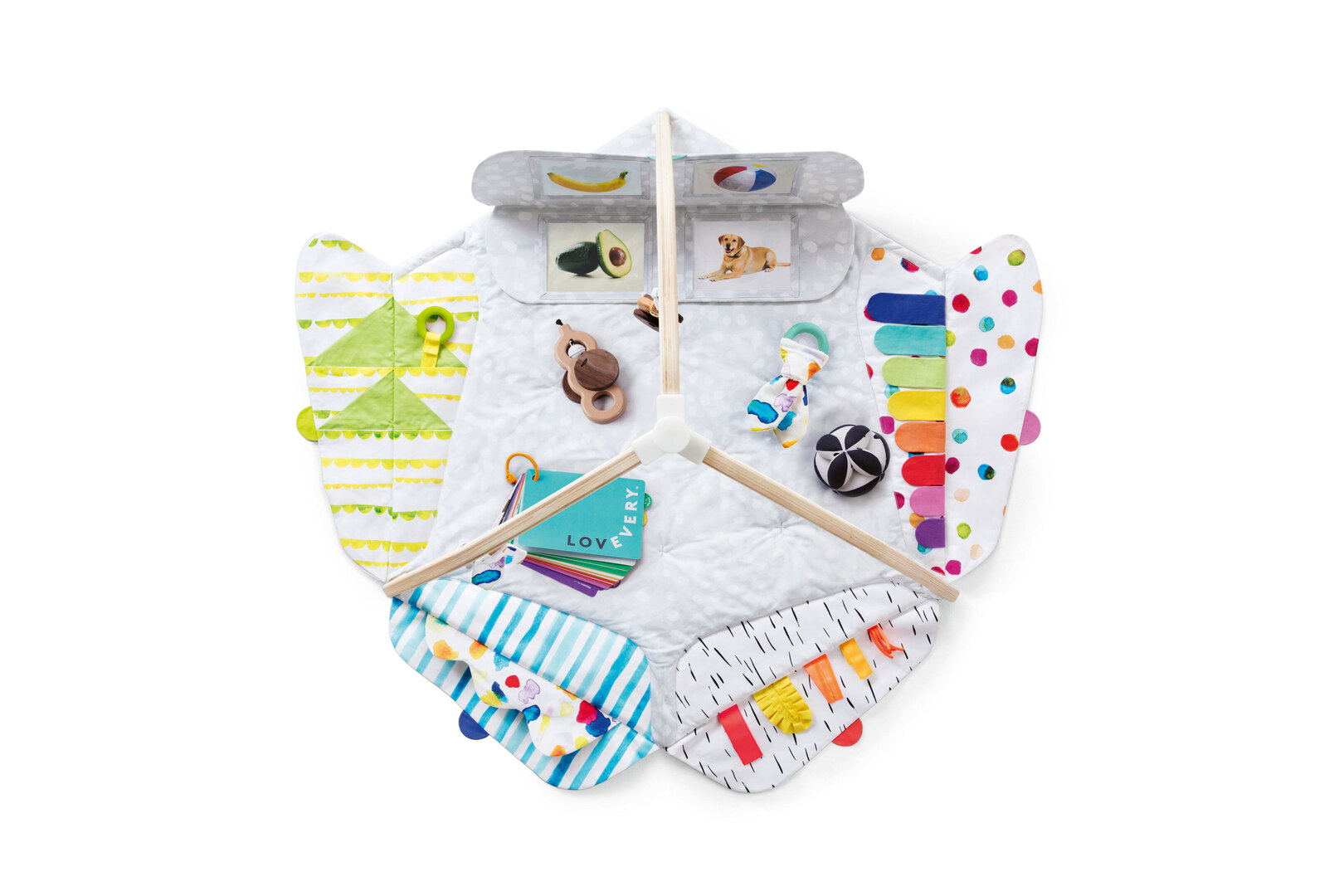 The Play Gym is a play mat with activity arch that accompanies babies during their first year. The mat has five educational zones at the edges which can be kept closed or opened according to the baby’s age. The child, according to its developmental stage, can thus look at educational images, feel fabrics, grasp items or discover colours and noises, without exposure to too much stimulation at one time. A brochure informs parents about the developmental phases and provides play suggestions for each month of life.