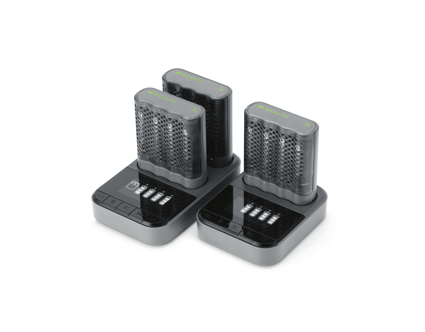 The ReCyko Pro Charger Range by GP allows simultaneous charging of up to eight batteries. A clear LED display shows the charge status of the individual charging devices. Designed to save space, the shape of the device picks up the contours of batteries that are inserted vertically. An automatic switch-off function after complete charging as well as operation via mains cable or via USB cable are additional practical product features.