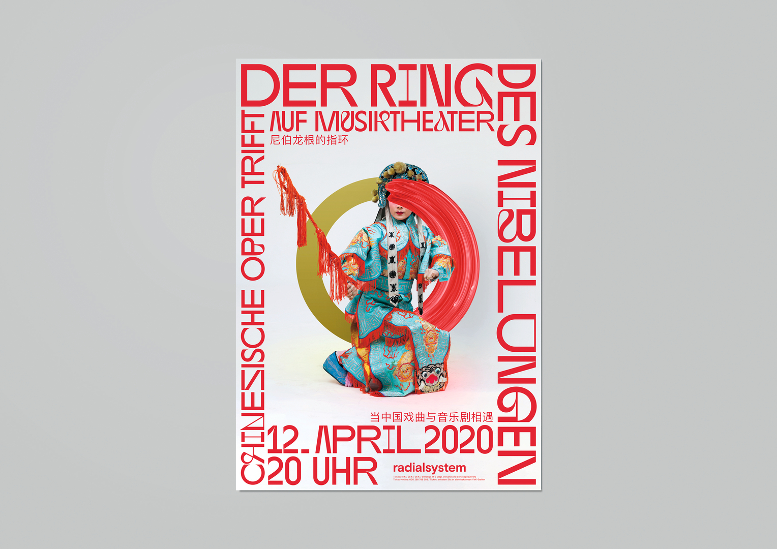 This poster design references Chinese opera and the German Nibelung legend to visualise the fusion of Western mythology and Eastern tradition in an intercultural theatre experiment, which, at the same time, avoids stereotypical design parameters. The poster shows a Chinese opera dancer who is entwined with a ring consisting of two contrasting halves. The gold section with its geometric style represents the Nibelung legend while the vibrant red brush-stroke calligraphy of the other half stands for Chinese opera. The composition is complemented by eye-catching bilingual typography.
