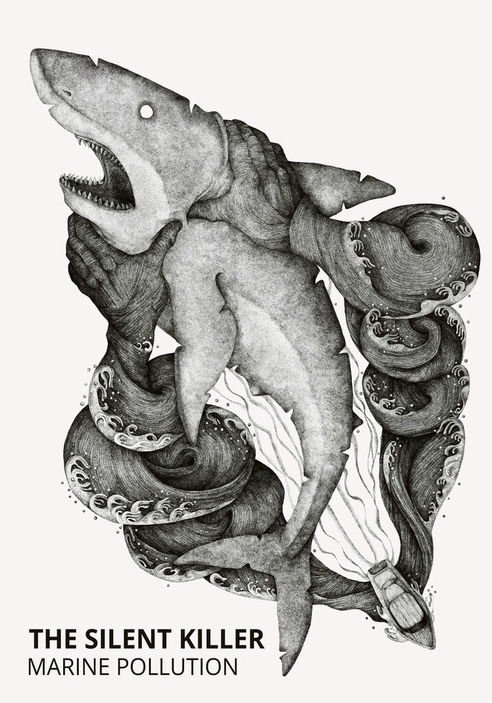The consequences of land, air and sea pollution are visible in the illustrations of The Silent Killer. They show animals suffocated by exhaust fumes or dying of contaminated soil and oil-polluted water – a creeping process communicated by the deliberately chosen pointillist technique. Dot by dot, the black-and-white illustrations converge to create a whole – just like the smallest amount of pollution caused by humans can lead to environmental damage of catastrophic proportions.