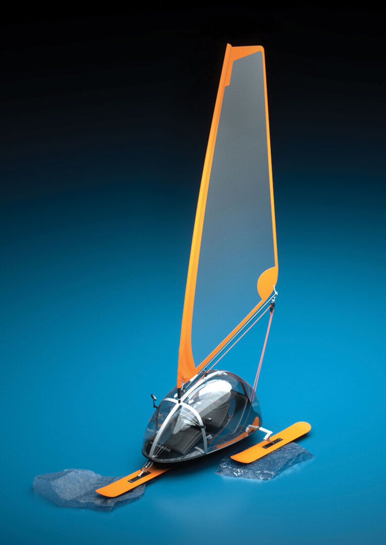The first custom-designed vehicle of its kind, The SWOOSH Snowsailer sails like a sailboat, windsurfer or kite on snow and ice, raising its sails and letting the wind take hold. The direction is controlled with foot steering, and the speed with the mainsheet from within the cockpit. The windier, the faster it goes; the flatter the surface, the easier the ride. As such, The SWOOSH is most efficient on snow plains and frozen lakes. Stabilised by three retrofitted snowboards with proprietary runner bars and a base plate, this prevents The SWOOSH from side slipping on snow, and when on the ice, allows it to run on the runner bar edges. Using quality materials and cutting-edge technology to speed across snow and ice, it is destined to be the next big thing in winter sports. The SWOOSH has been tested across the plains, alps, rivers and lakes of the world – all successfully reaching speeds in excess of 64km/h. An aircraft grade aluminium frame can be disassembled into four pieces for easy transportation. The cockpit, manufactured from carbon fibre and foam, includes storage compartments, side mirrors, sailing hardware, ropes and mounts, and cradles for smart devices. The polycarbonate canopy has gull wing doors for easy entry and exit, and a fibreglass and carbon mast can be fitted with a 5.5mt or 6.5mt Dacron and Mylar sail. Red Dot Award: Design Concept | Ready to Launch | Sports & Recreation