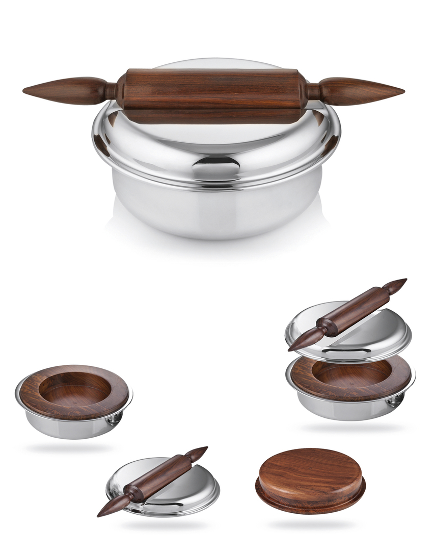 The Tattva Collection is a space-saving combination of kitchen utensils that have been adapted to the contemporary Indian lifestyle. Its four components facilitate the preparation of Indian bread. The basic element is a stainless steel kneading bowl into which a rolling base, made of fine Sheesham wood, can be accurately fitted. A stainless steel lid and a wooden rolling pin complete Tattva to become an expedient product solution.