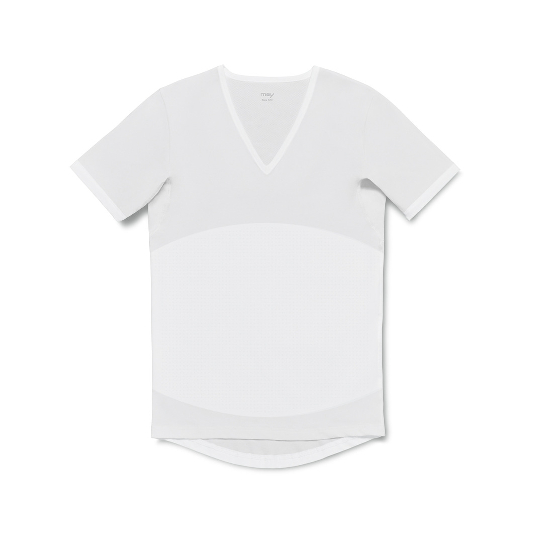 This undershirt for men is specially conceived for combination with business shirts. The highly elastic, innovative shape zone with its netlike raster shape at the midriff has a shaping effect. Inserts under the arms and at the neck assure good thermal regulation, breath-ability and very good moisture absorption. A special thread has an odourinhibiting effect. Due to its hydrophilic properties on the inside, the shirt absorbs perspiration. The hydrophobic exterior prevents formation of sweat marks on the business shirt. A deep V-neck allows the top buttons of the shirt to be opened. The extended back section prevents it from slipping out of the trousers.