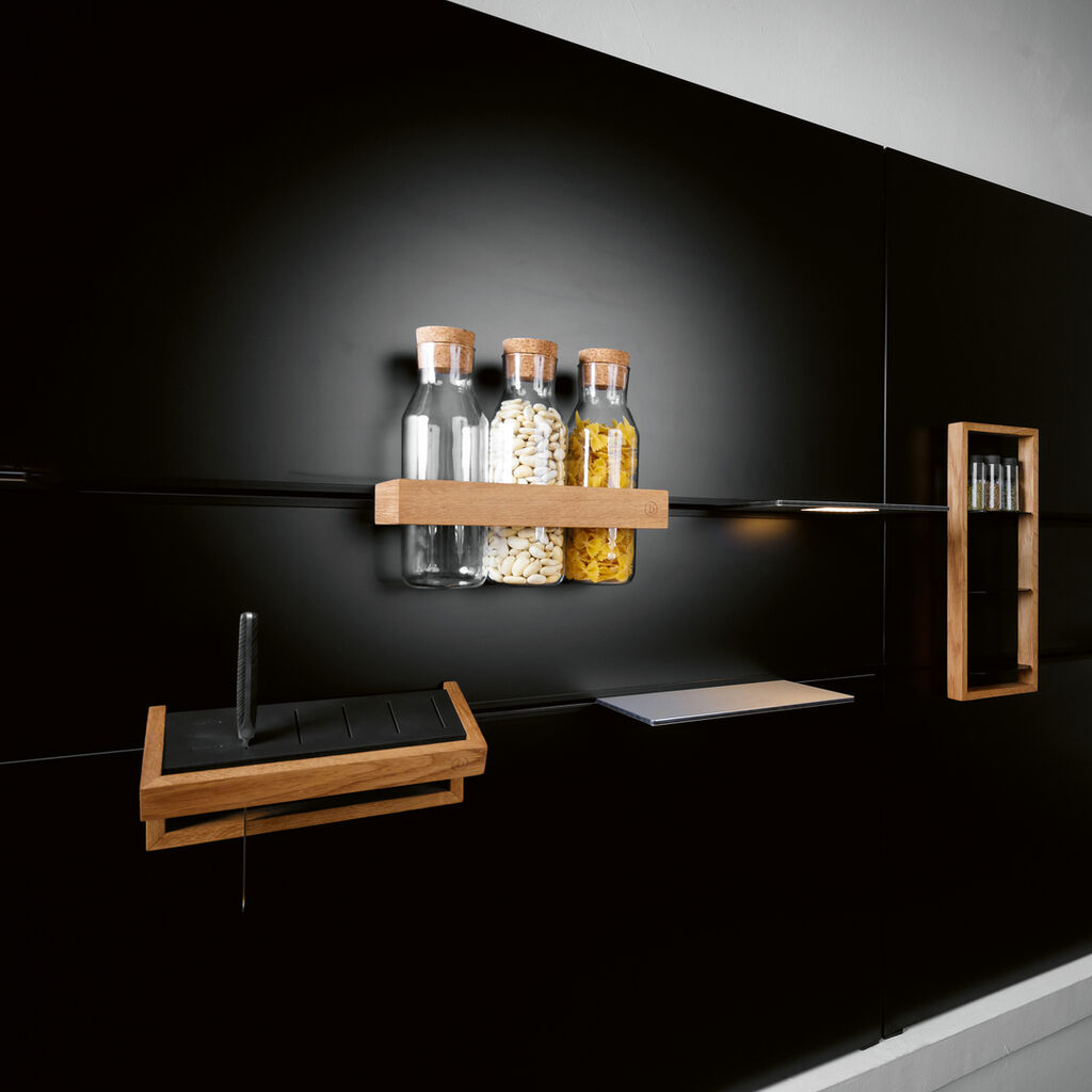By creating expressive forms for possible scenarios of future living, design has a significant influence on the planning and realisation of new ideas. Design thus also shapes the zeitgeist. The Wall is a novel modular rear panel system available in different surfaces that are easy to use and configure in a variety of ways thanks to being a sophisticated multifunctional assembly system. Their design combines modern technology with practical interior applications developed for current living environments. The innovative, light sandwich construction integrates mounting rails to form a modular, flexible construction wall. Connected in four phases, the rails allow a diverse range of assemblies, while the 6 mm thin shelves feature integrated LEDs ensuring that, when desired, they effectively catch the eye. USB docks can be added at the planning stage for creating individual arrangements with electricity and light exactly where wanted. Moreover, kitchen scales, contactless charging units, spotlights and other applications can also be added. All the accessories for this multifunctional, luminous rear panel system are freely positionable on the tracks, allowing for fully customisable configurations. The panel can be assembled quickly and easily. The sophisticated structural system features a minimalist and modern design vocabulary for staging and highlighting objects as needed.