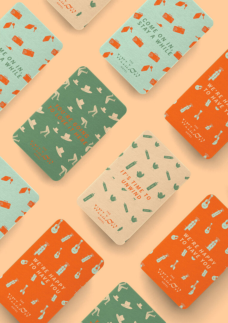 The Willow Hotel is a boutique hotel in Nashville, Tennessee. It aims to fit in the middle ground between traditional hospitality and crowd-sourced vacation. To reflect this claim, the branding draws on country-western style and combines it with modern elements. The type system is a modern take on country woodcut typography. Illustrations and patterns celebrate the local quirks of the city’s culture, while humorous texts enhance brand recognition. As a result, the visual identity is flexible with the ability to focus on either illustration, colours, type or photography.
