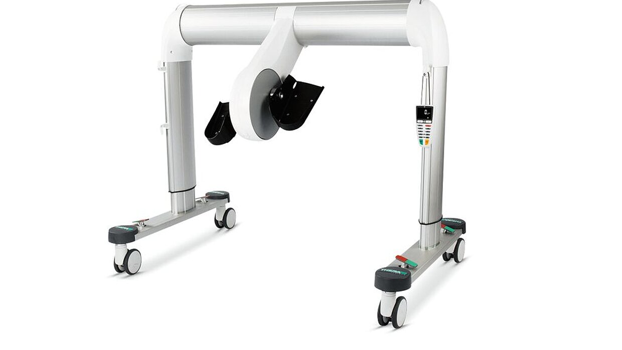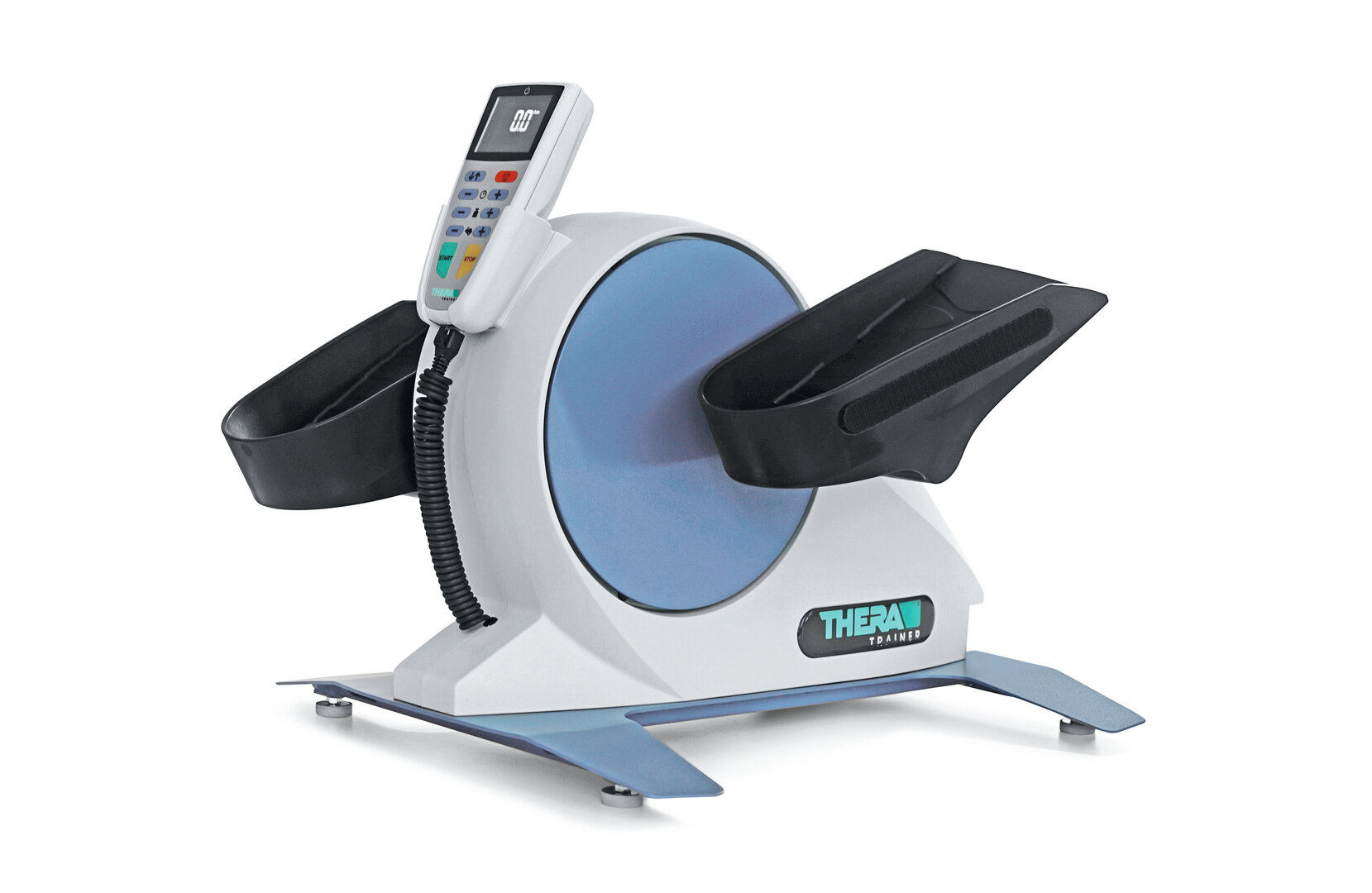 The Thera-Trainer mobi is a lightweight and practical exerciser for the motor-supported training of arms and legs. It is designed for the mobilisation of the elderly and of people with slight physical limitations. The design focus is placed on high-quality ergonomics and intuitive use. Furthermore, the surfaces are easy to clean. The interlocking system enables a quick, tool-free exchange of footrests and therapy grips.