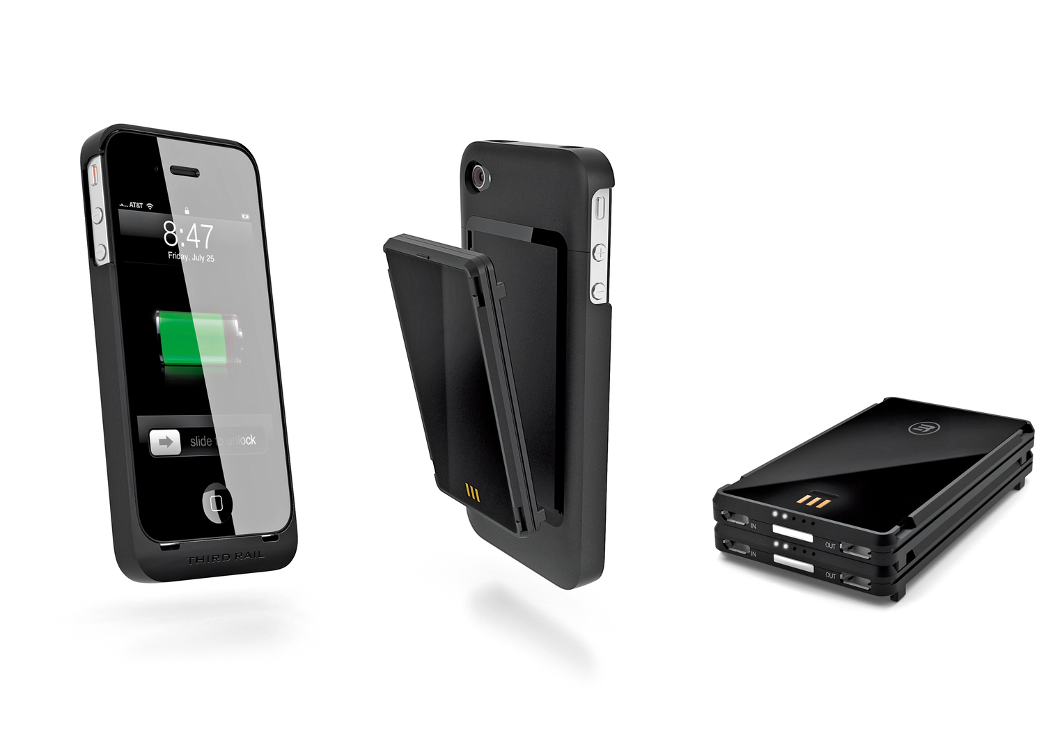 The Third Rail System includes a slim case for the iPhone 4/4S and an optional modular battery, which can be purchased individually or as a set. The battery has a capacity of 1250 mAh and is slid onto the back of the case in order to charge the iPhone, up to six batteries can be combined. In addition, the battery is capable of charging other devices, such as smartphones by other manufacturers, using the included micro-USB cable.