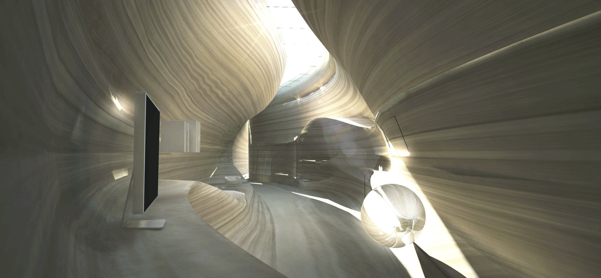 Rejecting the current residential typology and lavish suburban lifestyle, the house stands as a subterranean, meandering trace of water. Materialising natural drainage patterns of the site into a set of rippling surfaces, it crafts a solemn yet intimate spatial experience, while serving as an attenuated catchment path and greywater treatment course. Architecture as manifesto - While issues such as global warming and sea level rise consume attention of a majority of the design field, The Thirsty House aims to alarm the public of the imminent global water crisis as a spartan retreat in a hypothetical post-water age. Prototyped symbolically for World’s End Park, Boston, a decision far from coincidental, the Thirsty House is a product that can be designed algorithmically and manufactured digitally for future locations, expanding the reach of its advocacy. Reducing water footprint - Rainwater and groundwater runoff can be collected and purified along the stretch of the house to sustain basic living needs, now arranged in the order of optimised water reuse: from drinking outlet to kitchen sink, from basin to cloth washing station, and from bathing caldron to toilet. The main structure consists of a plastic composite shell, wood interior finish, and a layer of styrofoam insulation in between, all pre-fabricated off-site and in segments to ensure minimal excavation, fast installation and conservation of energy. These materials are carefully selected for their minimal embodied water usage. Connection to landscape - The subterranean house nestles deep into the hillside to minimise building footprint, construction impact and visual disruption. Situated along the direction of groundwater flow, it renders the surrounding landscape both off-grid infrastructure to support reduced residential plumbing needs, and surrogate for the notoriously water-consuming front and back yards. Earth-sheltered, the house benefits from not only an introspective spatial experience, but also a reduction in exposed surface area, temperature fluctuation, and energy usage.