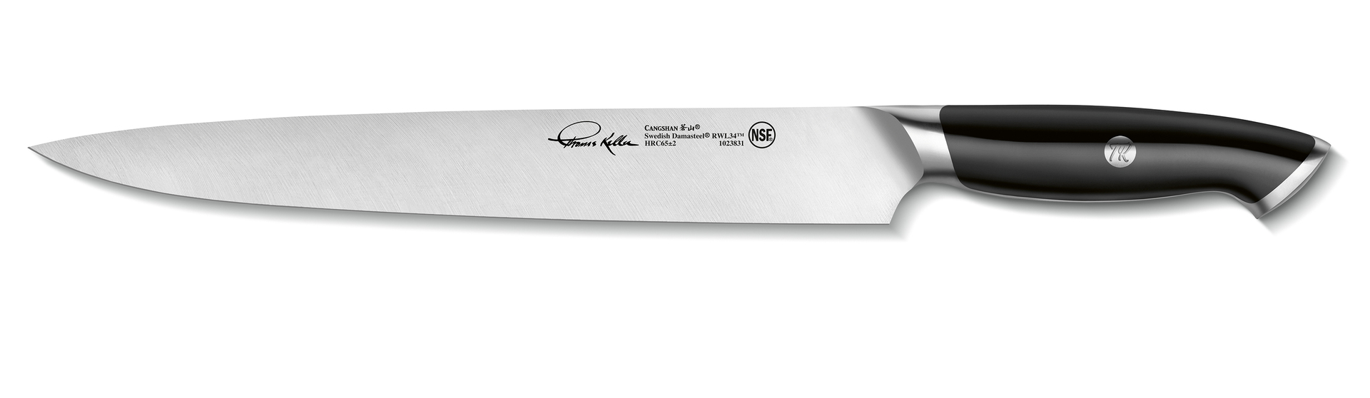 These kitchen knives were developed in cooperation with the renowned American chef Thomas Keller. They are forged from Swedish RWL34 Powdered Steel; a high alloy steel known for its excellent edge strength, hardness and corrosion resistance. After a precise heat treatment, these knives achieve a Rockwell Hardness Rating of 62 + / - 2. The structure of the steel gives the knives remarkable edge retention. Bold angles create a focus on the minimalist silhouette.