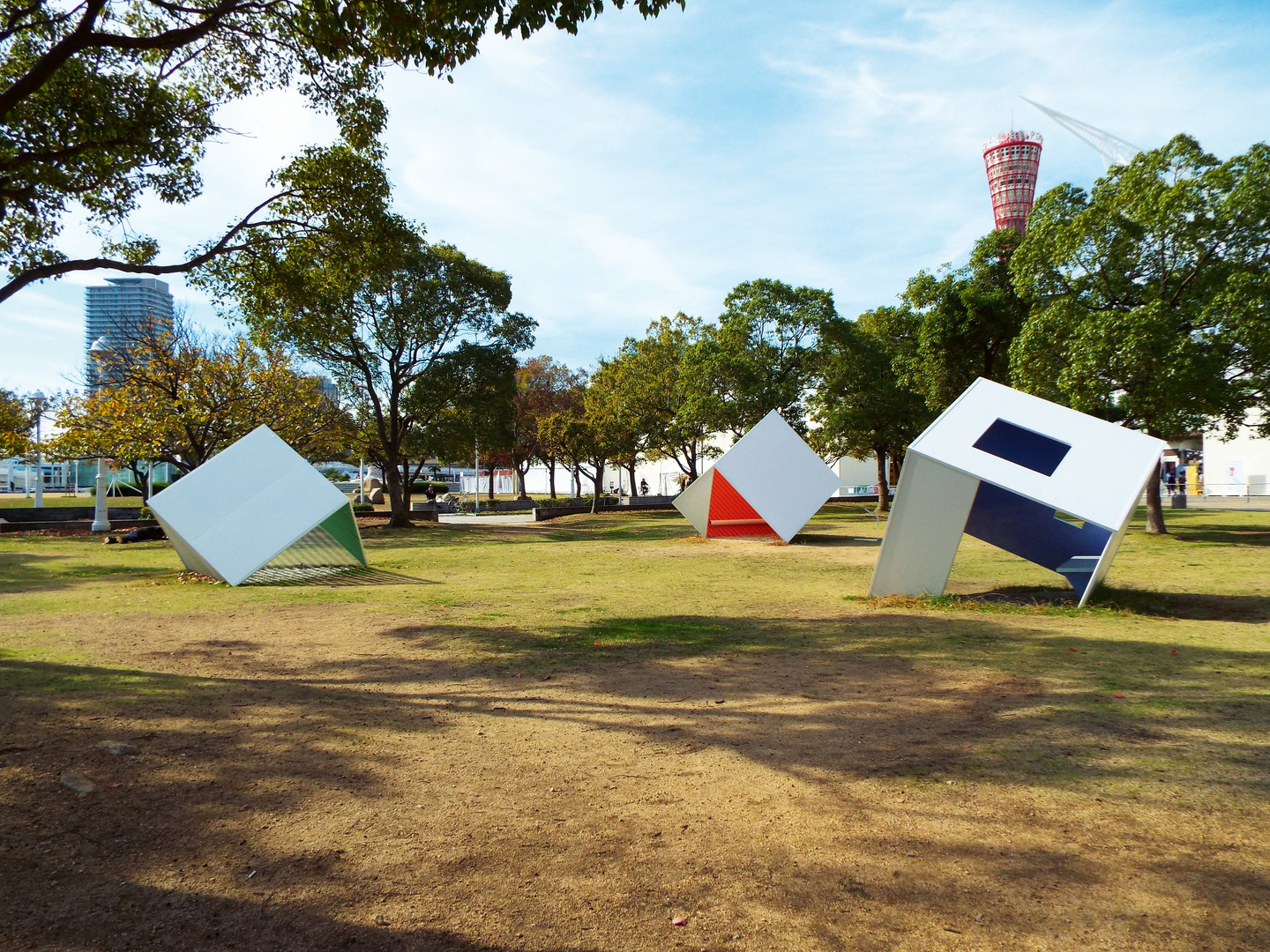 These movable pavilions can be used for numerous functions. They can serve as playground equipment for children, art objects, meditation rooms, arbours, small rest spaces, public furniture or sheltered seating. In a group of three cubes that recall typical Japanese spaces such as tea houses, they have an impressive impact in public spaces. One section of each cube has been cut off. The cubes are positioned at different angles with the cut surface placed on the ground.