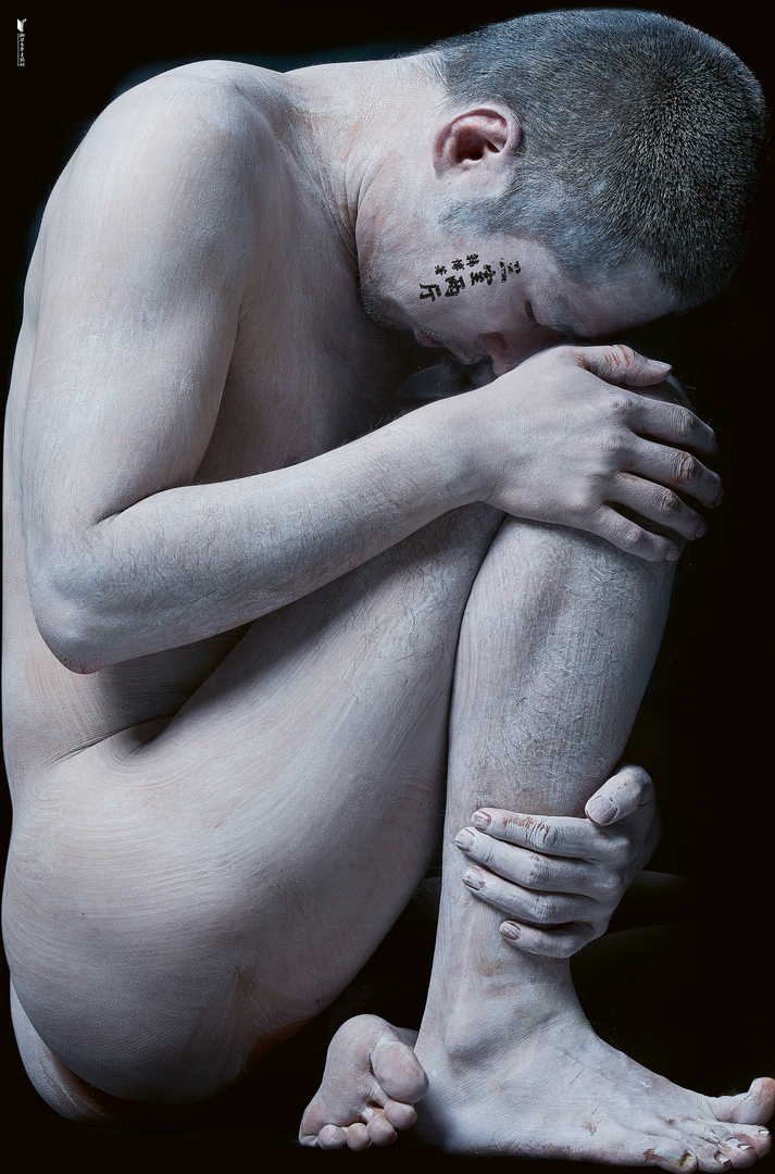 These posters provide the images for the book “Three Rooms and Two Halls” by Chinese poet Han Bo. The title describes the idea of the ideal living environment many contemporaries in China have, but also the boundaries of their view of the world. These boundaries are reflected in the motif: a man squats all alone at the centre of the image. He is naked and covered only in white paint. His gaze is directed downward into empty space. The writing on his cheek creates a direct link to the book, showing the title and the author’s name in black letters.
