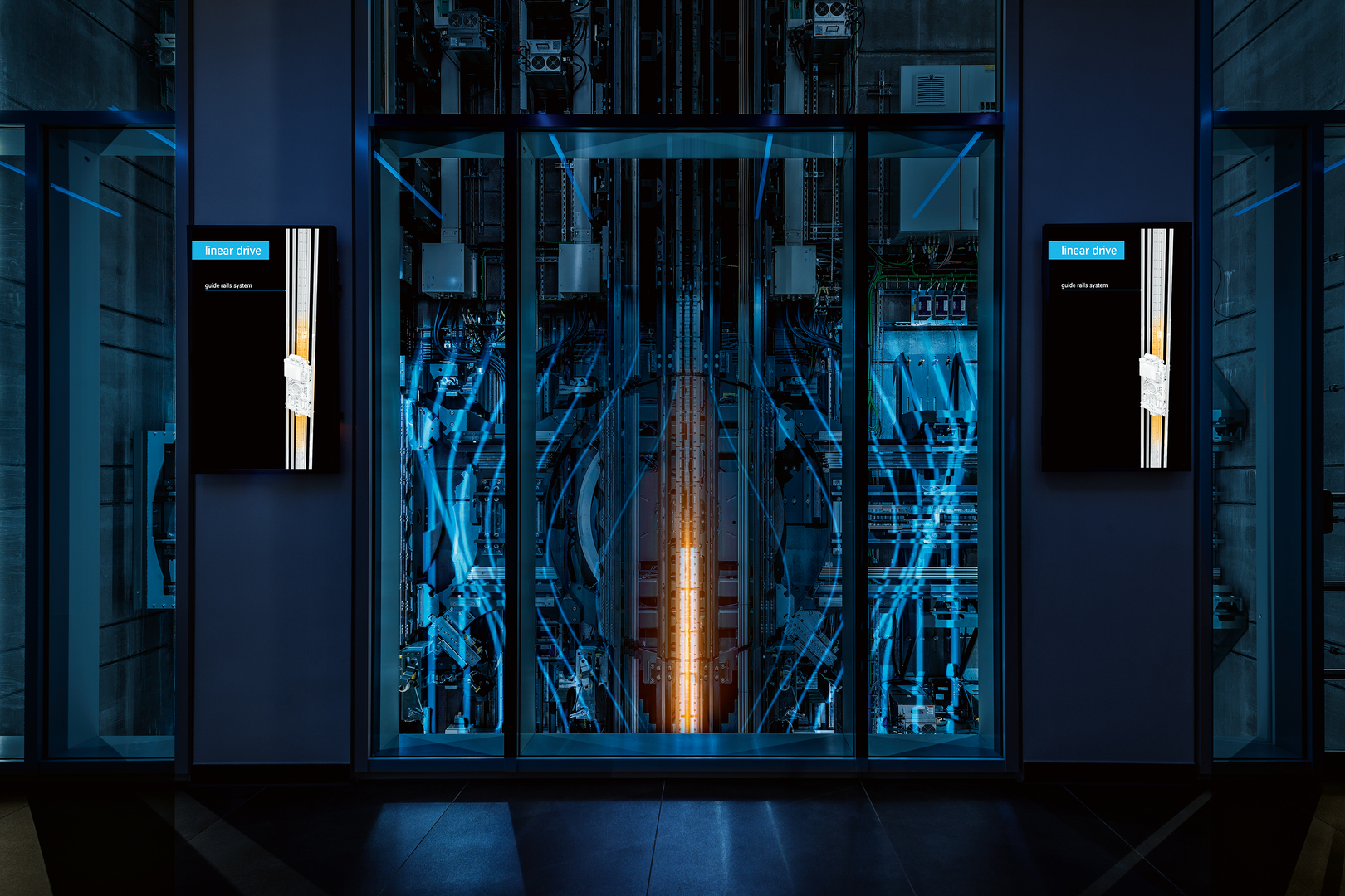 The thyssenkrupp Elevator Test Tower visitor centre invites people to experience the company in a highly differentiated way. Designed as more than just a functional building for research and development, it has become a place for intensive exchange with corporate customers. Modular scenography was created for the staging of three objectives: the revolutionary, magnetic, levitation-based lift technology, the Elevator as representing the company and the tower itself.