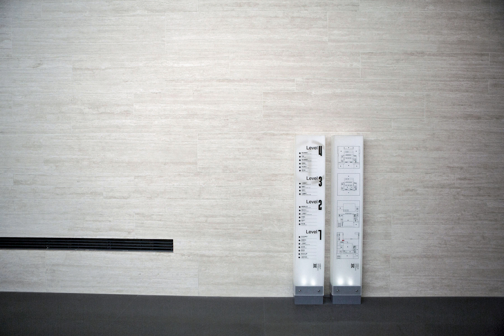 The Tianjin Art Museum, a landmark of the city of Tianjin, is one of the most modern museums in China. Stressing its architectural purism, the signage design uses simple boxes, with the idea of creating transparency and setting clear priorities in these public spaces. The special font used on the boxes fits well with the atmosphere of this modern art museum. For ecological purposes, the signage system was designed with a 3form Chroma renewable matte, as it helps reduce carbon consumption.