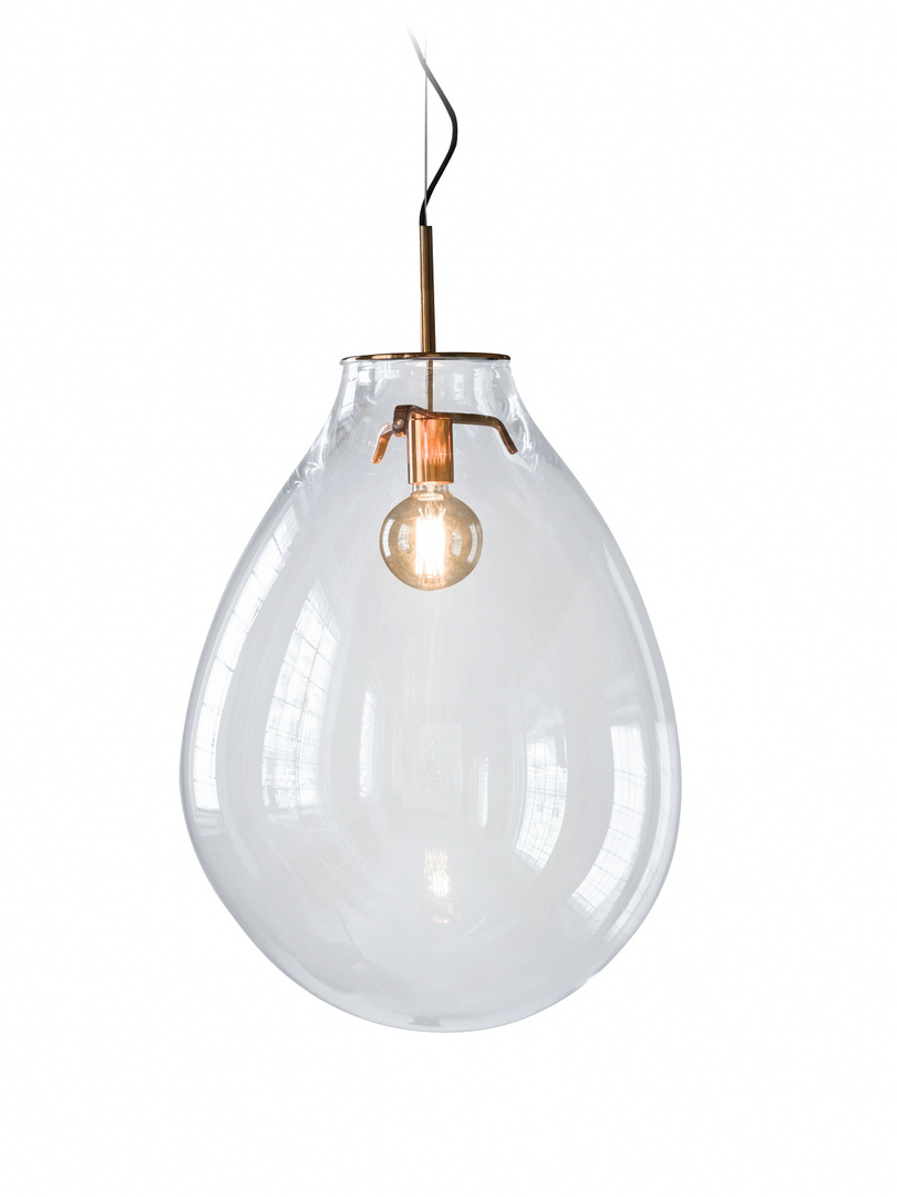 Tim is an oversized, hand-blown pendant luminaire made of crystal glass. It was designed for an exhibition on the director Tim Burton and his surreal movie worlds. Every single luminaire is a unique piece and reminiscent of a gigantic water drop. Manufacturing a luminaire of this size requires the skills of experienced glassmakers. Complementary to this version, Tim is also available in smaller dimensions for installation in living spaces.