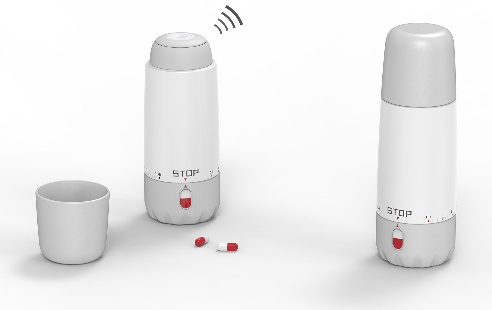Timer Bottle is a special bottle composed of an upper section that works as a drinking cup, and a lower section that works as a pill case incorporated with a reminder function. Patients can set intervals for taking their medicine accordingly by rotating the case. When it is time to take medicine, Timer Bottle will sound an alert tone. The alert will stop when the patient takes the pills out of the case. Timer Bottle can also be used as a regular water bottle in daily life.