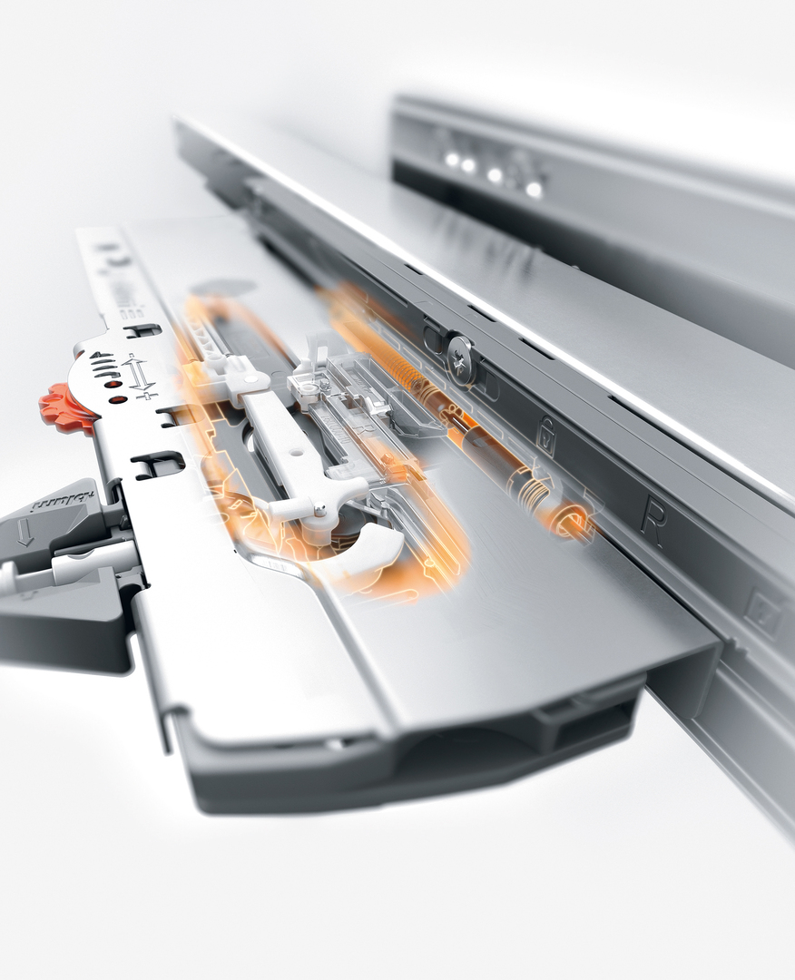 Tip-on Blumotion is a motion technology which facilitates convenient opening of handle-less fronts. It involves a mechanical solution which combines two functions: easy opening with one touch (Tip-on) and dampened, quiet closing (Blumotion). In spite of its minimum front gap of only 2.5 mm, doors and drawers can be reliably opened. The gap alignment can be adjusted accurately due to four-dimensional setting options.
