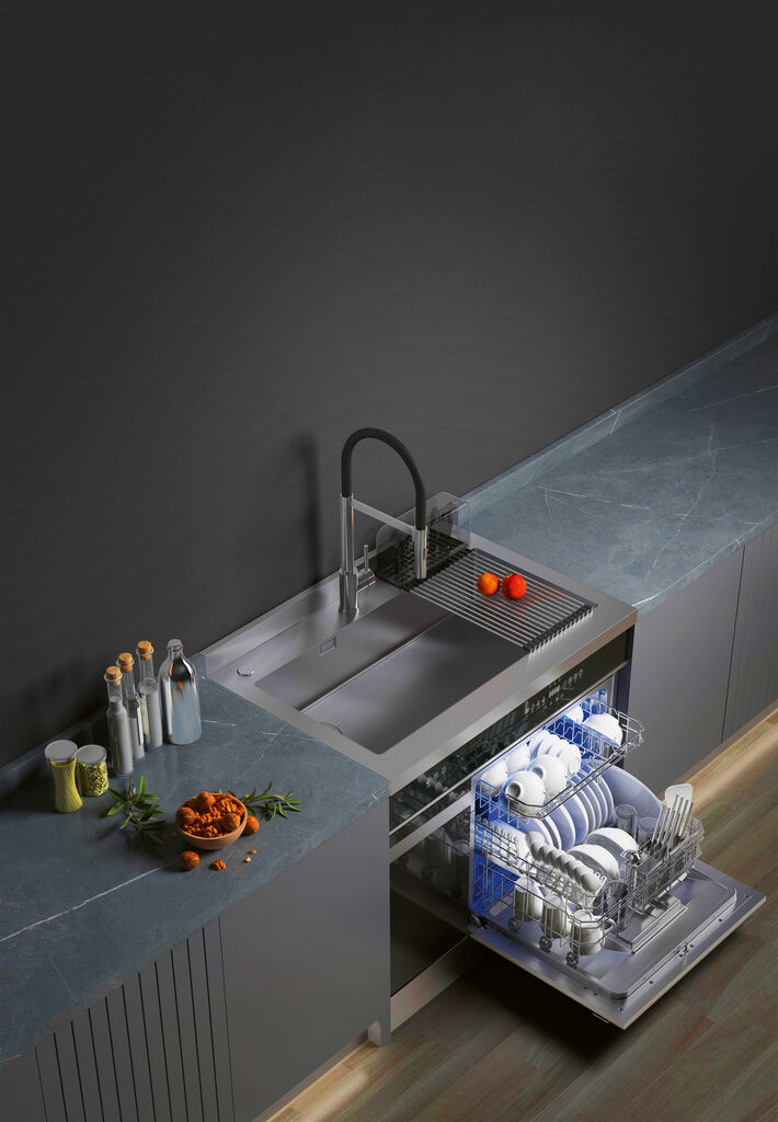 TIVALI is a kitchen unit that combines a dishwasher with a kitchen sink. A wide stainless steel basin with a draining board offers enough space for cleaning larger pots and pans. Thanks to the flexible tap, cleaning is effortless. The dishwasher can be operated intuitively via the clearly arranged symbols on a touchscreen and offers numerous programs. A display provides information about the cleaning status. The stainless steel housing has a high-quality appearance and gives the element the look of a professional kitchen. In addition, the black display surface accentuates the front very successfully, said the jury about their decision.