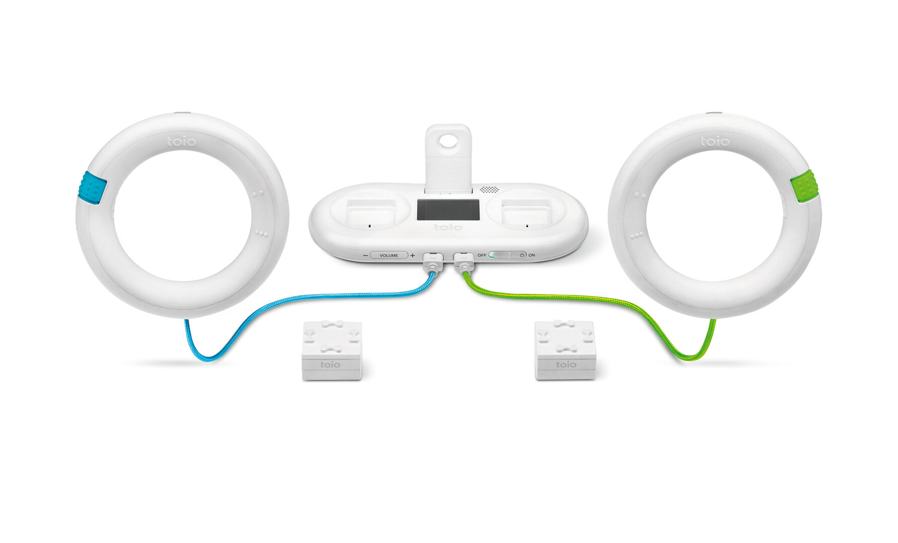 toio is an innovative entertainment system whereby the most important components are two simple, cubic robots. They serve as a basis for allowing users to create their own toys with Lego blocks, paper or other elements. The robots are controlled by ring-shaped controls, plug-in modules and a console which issues commands to the robot via Bluetooth. The modules extend the play options and facilitate, for example, robot battles, races, sports, art or programming.