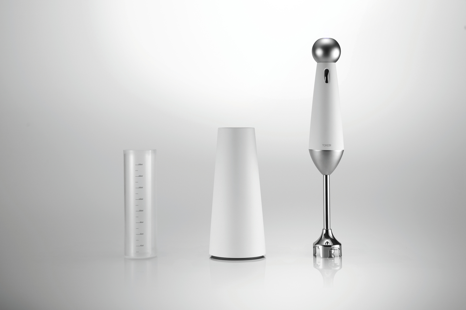 The puristic form language of this elegant hand blender was made possible by redeveloping the motor. The lines of this kitchen appliance, which surprises by the homogenous style of the blender, the mixing and the measuring cup, are based on the contours of a cone.