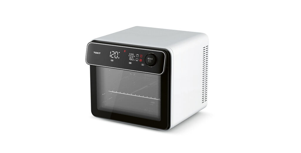 The compact TOKIT Smart Oven is equipped with an innovative heating technology. The oven has two efficient carbon fibre heating elements that interact with the temperature sensors. This enables an even and precise heat propagation inside. A special feature is the integrated camera. This allows to record food during baking and then share it using the TOKIT app. The appearance is characterised by a clear design and a display integrated into the handle.
