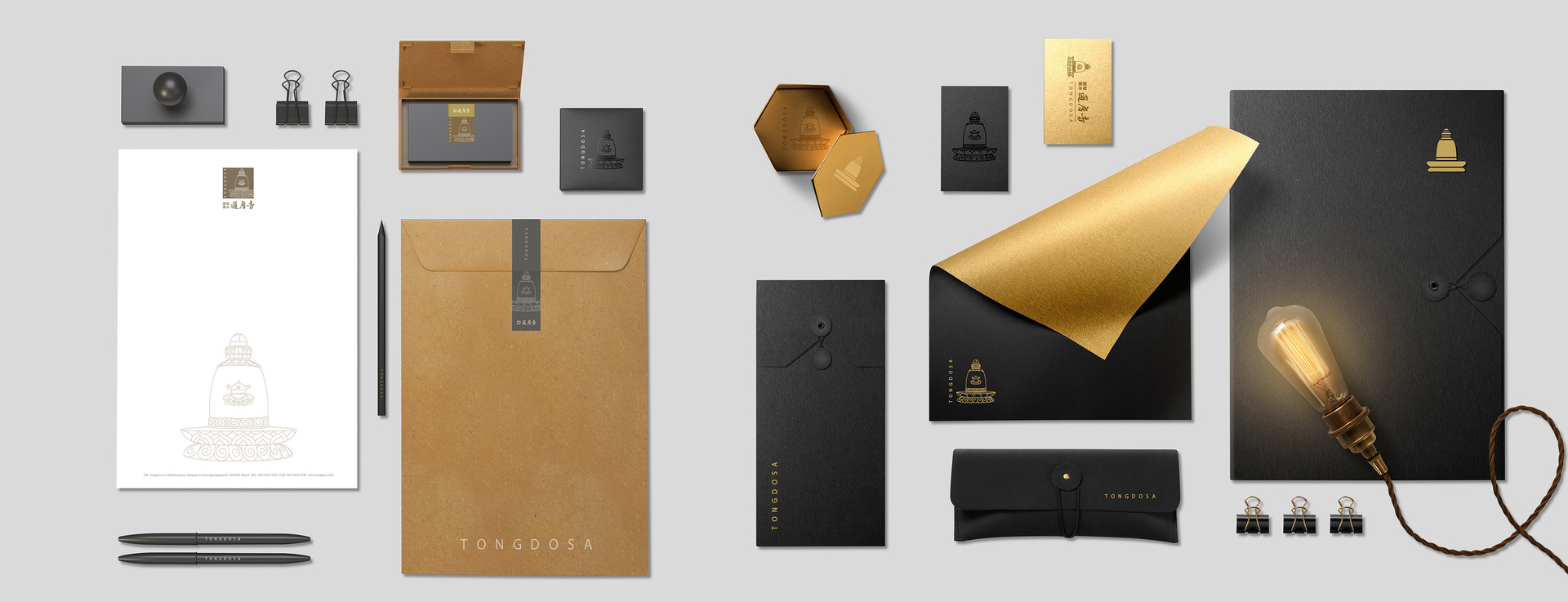 The identity of the Tongdo-sa temple is embodied by a stupa motif. It symbolises the temple’s various treasures and designated cultural assets. In addition, at Tongdo-sa, the stupa is part of a pagoda that enshrines small crystals of Buddha as relics. The identity visualises the stupa in various forms of lines and faces, conveying Korean sentiment and tradition, as well as modern beauty. For the logotype, the long-established typeface of the temple’s signboard was used and rendered in a warm grey tone to evoke the beauty of tradition and authority.