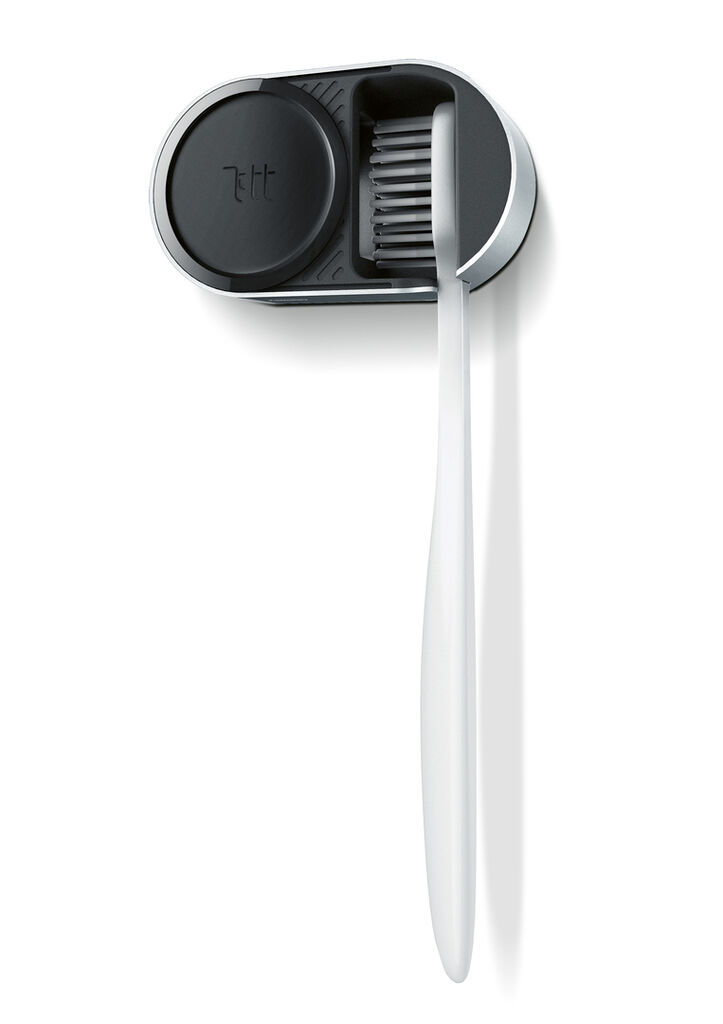After disinfecting the toothbrush head with ultraviolet light, this device dries the bristles with a tiny fan. A built-in magnetic sensor detects movements of the sliding cover and starts the disinfection only when the cover is completely closed. Thus protected from harmful UV light, users can safely watch the disinfection process through the slightly transparent cover. After 60 seconds, the unit switches off automatically.