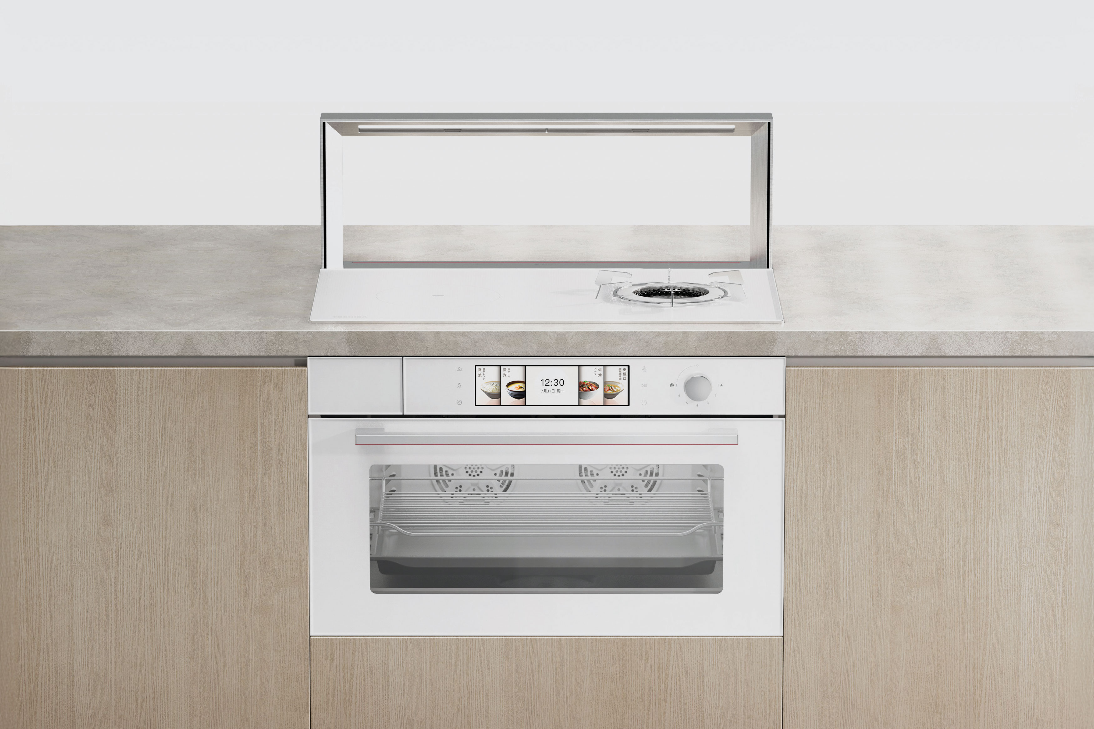 The Toshiba Integrated Cooking Center has a modular design and integrates multiple functions such as open-flame cooking, electromagnetic cooking, and oven cooking. It can be neatly flushed and embedded in the kitchen countertop without damaging it. An innovative hood module keeps the kitchen island open while efficiently eliminating smoke. Advanced sensors identify users and provide smart cooking modes via algorithms.