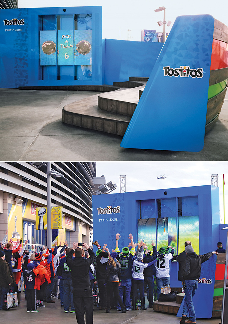 The Tostitos Party Zone delivers an exciting experience based on football at New York’s MetLife Stadium. Designed as a scoop-shaped structure, it invites people to gather and play while waiting for the game. Using proprietary technology consisting of LED panels moving on tracks, it reacts to digital content and is programmed with two sequences. An eye-catching animation with energised music was staged around the topic of “Bringing the Party”. Furthermore, an American football video game using crowd-recognition technology allows a large number of fans to play in two teams at the same time – and thanks to this technology, the more synchronised the team, the better it performs.