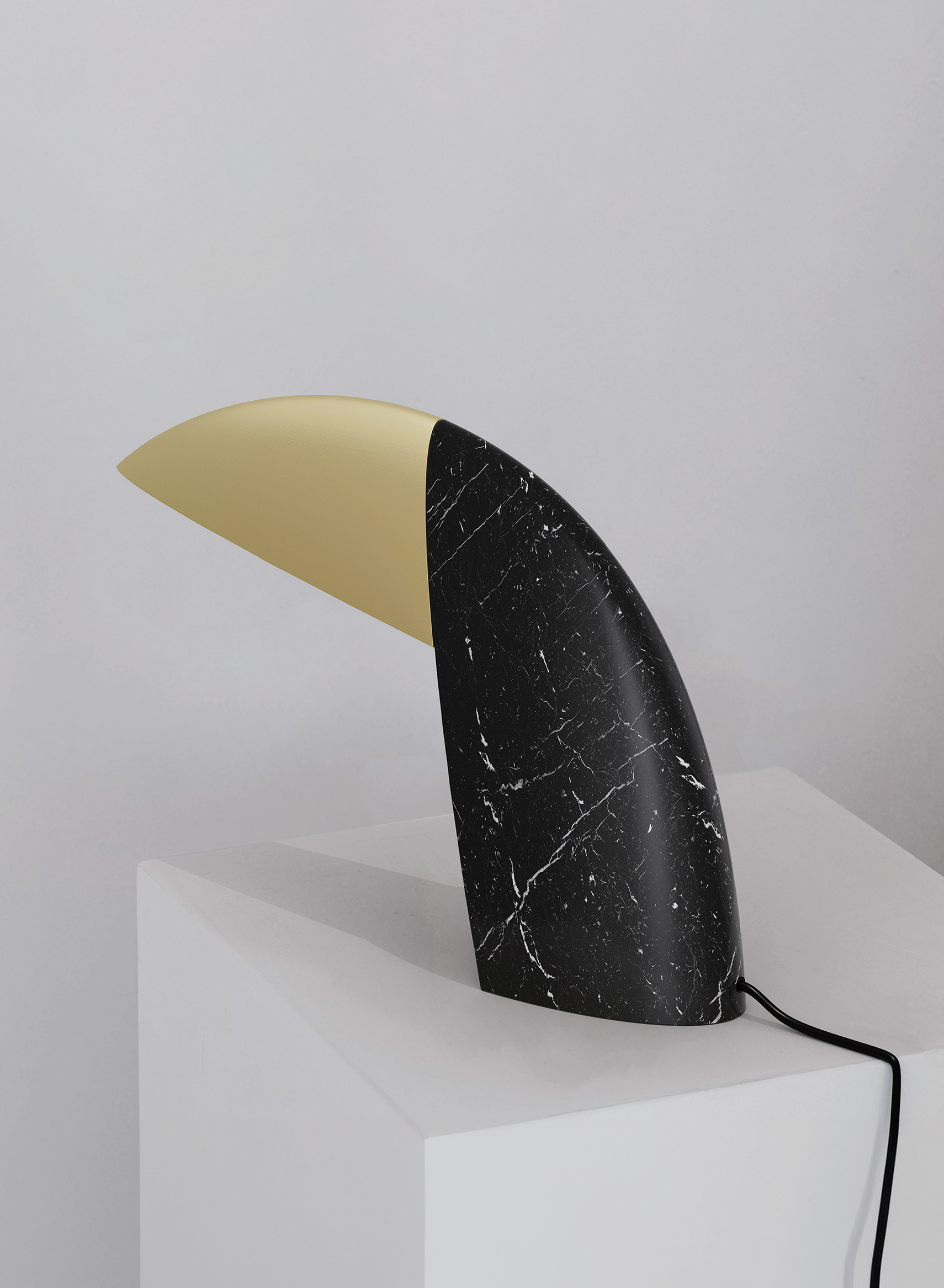 The TOUCAN TABLE LAMP draws inspiration from rainforest toucans and uses the Fibonacci sequence for balanced proportions. Its playful, sculptural design features a forward-leaning brass shade resembling a bird’s beak and a stable marble base. The shade emits soft light, enhancing the marble’s texture. Ideal for desks or ambient lighting, it adds a free-spirited and artistic atmosphere to any space. Red Dot Award: Design Concept | Ready For Market | Lamps and Luminaires